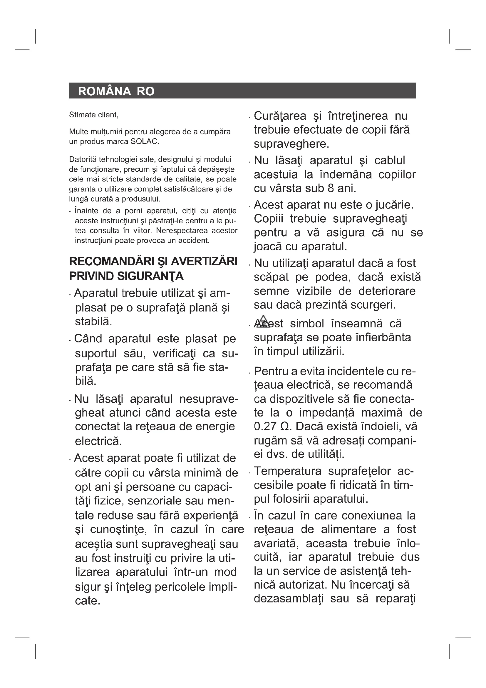 Stimate client, Multe mulțumiri pentru alegerea de a cumpăra un produs marca SOLAC. Datorită tehnologiei sale, designului şi modului de funcţionare, precum şi faptului că depăşeşte cele mai stricte standarde de calitate, se poate garanta o utilizare complet satisfăcătoare şi de lungă durată a produsului.