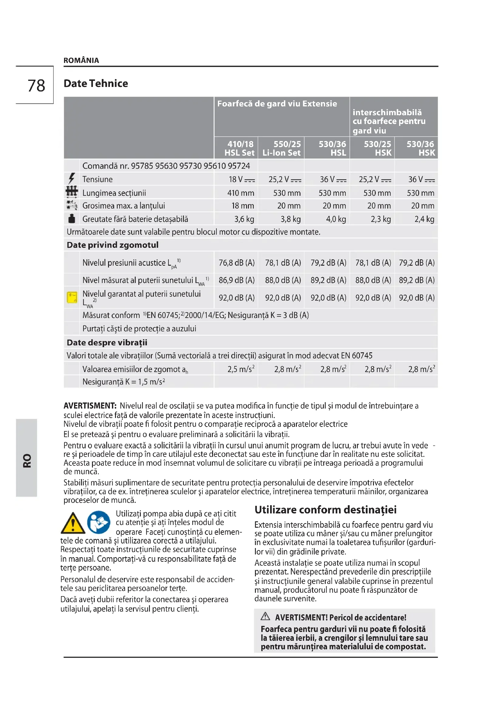 tele sau periclitarea persoanelor terţe. Dacă aveţi dubii referitor la conectarea şi operarea utilajului, apelaţi la servisul pentru clienţi. Utilizare conform destinaţiei Extensia interschimbabilă cu foarfece pentru gard viu se poate utiliza cu mâner și/sau cu mâner prelungitor în exclusivitate numai la toaletarea tușurilor (garduri- lor vii) din grădinile private. Această instalaţie se poate utiliza numai în scopul prezentat. Nerespectând prevederile din prescripţiile şi instrucţiunile general valabile cuprinse în prezentul manual, producătorul nu poate răspunzător de daunele survenite. AVERTISMENT! Pericol de accidentare! Foarfeca pentru garduri vii nu poate folosită la tăierea ierbii, a crengilor și lemnului tare sau pentru mărunțirea materialului de compostat. Date Tehnice Foarfecă de gard viu Extensie interschimbabilă cu foarfece pentru gard viu 410/18 HSL Set 550/25 Li-Ion Set 530/36 HSL 530/25 HSK 530/36 HSK Comandă nr. 95785 95630 95730 95610 95724 Tensiune 18 V 25,2 V 36 V 25,2 V 36 V Lungimea secţiunii 410 mm 530 mm 530 mm 530 mm 530 mm Grosimea max. a lanțului 18 mm 20 mm 20 mm 20 mm 20 mm Greutate fără baterie detașabilă 3,6 kg 3,8 kg 4,0 kg 2,3 kg 2,4 kg Următoarele date sunt valabile pentru blocul motor cu dispozitive montate. Date privind zgomotul Nivelul presiunii acustice L