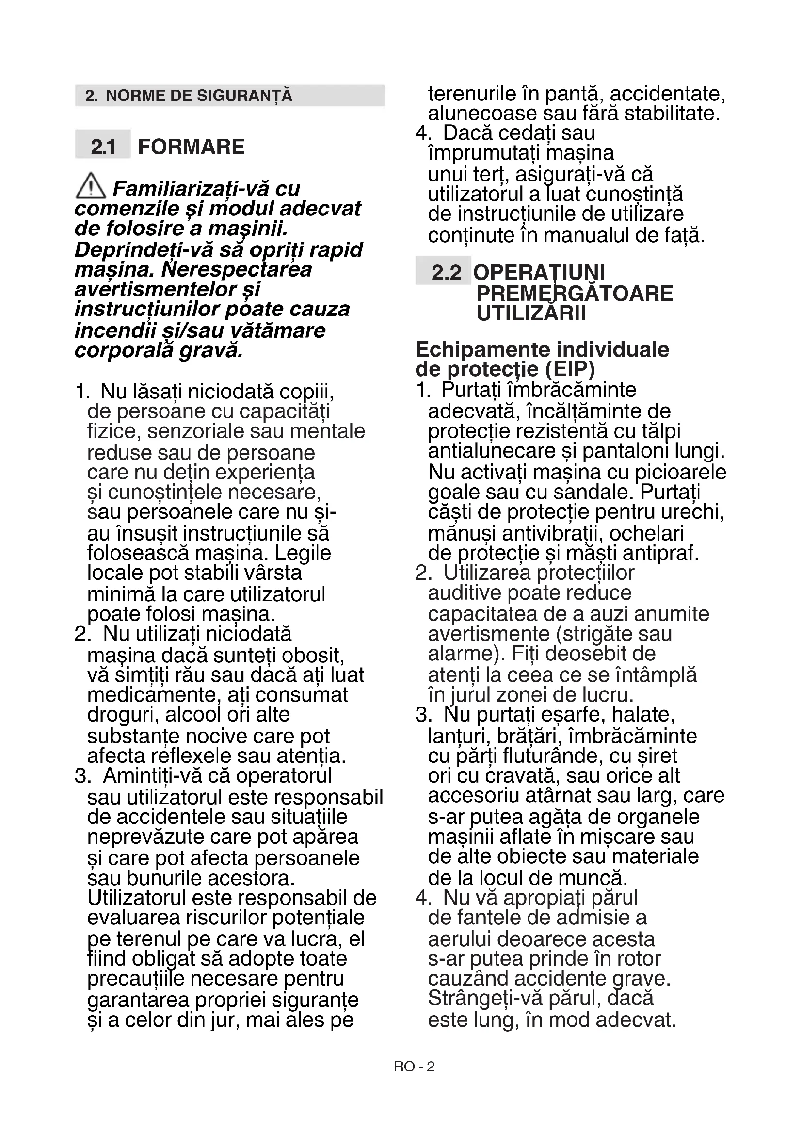 sau utilizatorul este responsabil de accidentele sau situaţiile neprevăzute care pot apărea şi care pot afecta persoanele sau bunurile acestora. Utilizatorul este responsabil de evaluarea riscurilor potenţiale pe terenul pe care va lucra, el ind obligat să adopte toate precauţiile necesare pentru garantarea propriei siguranţe şi a celor din jur, mai ales pe terenurile în pantă, accidentate, alunecoase sau fără stabilitate.
