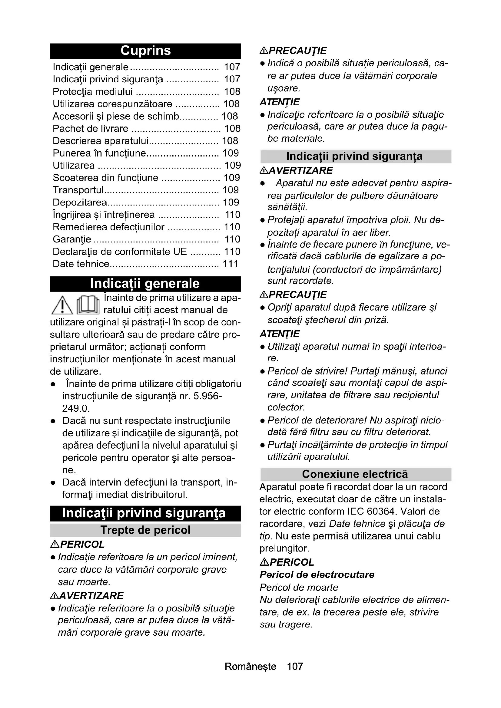- ● Dacă nu sunt respectate instrucţiunile de utilizare şi indicaţiile de siguranţă, pot apărea defecţiuni la nivelul aparatului şi pericole pentru operator şi alte persoa- ne. ● Dacă intervin defecţiuni la transport, in- formaţi imediat distribuitorul. Indicaţii privind siguranţa Trepte de pericol PERICOL ● Indicaţie referitoare la un pericol iminent, care duce la vătămări corporale grave sau moarte. 몇 AVERTIZARE ● Indicaţie referitoare la o posibilă situaţie periculoasă, care ar putea duce la vătă- mări corporale grave sau moarte. 몇 PRECAUŢIE ● Indică o posibilă situaţie periculoasă, ca- re ar putea duce la vătămări corporale uşoare. ATENŢIE ● Indicaţie referitoare la o posibilă situaţie periculoasă, care ar putea duce la pagu- be materiale. Indicații privind siguranța 몇 AVERTIZARE ● Aparatul nu este adecvat pentru aspira- rea particulelor de pulbere dăunătoare sănătăţii. ● Protejați aparatul împotriva ploii. Nu de- pozitați aparatul în aer liber. ● Înainte de fiecare punere în funcţiune, ve- rificată dacă cablurile de egalizare a po- tenţialului (conductori de împământare) sunt racordate. 몇 PRECAUŢIE ● Opriţi aparatul după fiecare utilizare şi scoateţi ştecherul din priză. ATENŢIE ● Utilizaţi aparatul numai în spaţii interioa- re. ● Pericol de strivire! Purtaţi mănuşi, atunci când scoateţi sau montaţi capul de aspi- rare, unitatea de filtrare sau recipientul colector. ● Pericol de deteriorare! Nu aspiraţi nicio- dată fără filtru sau cu filtru deteriorat. ● Purtaţi încălţăminte de protecţie în timpul utilizării aparatului. Conexiune electrică Aparatul poate fi racordat doar la un racord electric, executat doar de către un instala- tor electric conform IEC 60364. Valori de racordare, vezi Date tehnice şi plăcuţa de tip. Nu este permisă utilizarea unui cablu prelungitor. PERICOL Pericol de electrocutare Pericol de moarte Nu deterioraţi cablurile electrice de alimen- tare, de ex. la trecerea peste ele, strivire sau tragere. Indicații generale p. 107