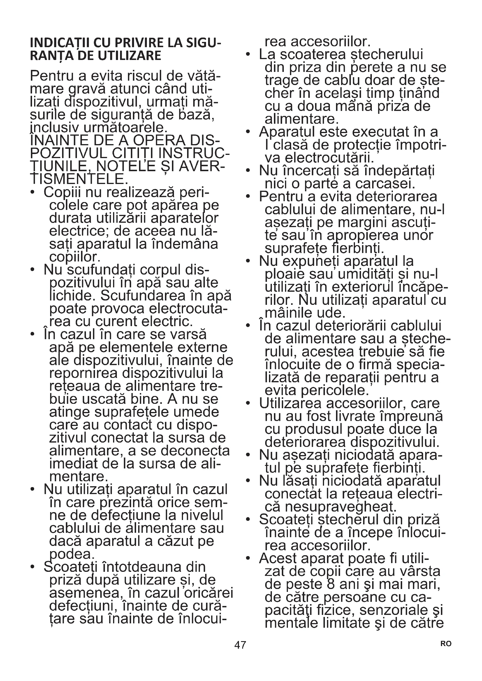 - Acest aparat poate utili- zat de copii care au vârsta de peste 8 ani şi mai mari, de către persoane cu ca- pacităţi zice, senzoriale şi mentale limitate şi de către RO48 persoane fără experienţă şi care nu cunosc aparat, atunci când acestea sunt supravegheate sau au fost instruite cu privire la utiliza- rea aparatului în siguranţă şi cunosc pericolele care reies din utilizarea acestui aparat. Nu lăsați copiii să se joace cu dispozitivul. Curățarea și întreținerea dispozitivului nu trebuie efectuate de către copii, cu excepția cazului în care aceștia au cel puțin 8 ani și sunt supravegheați de o persoană adecvată.