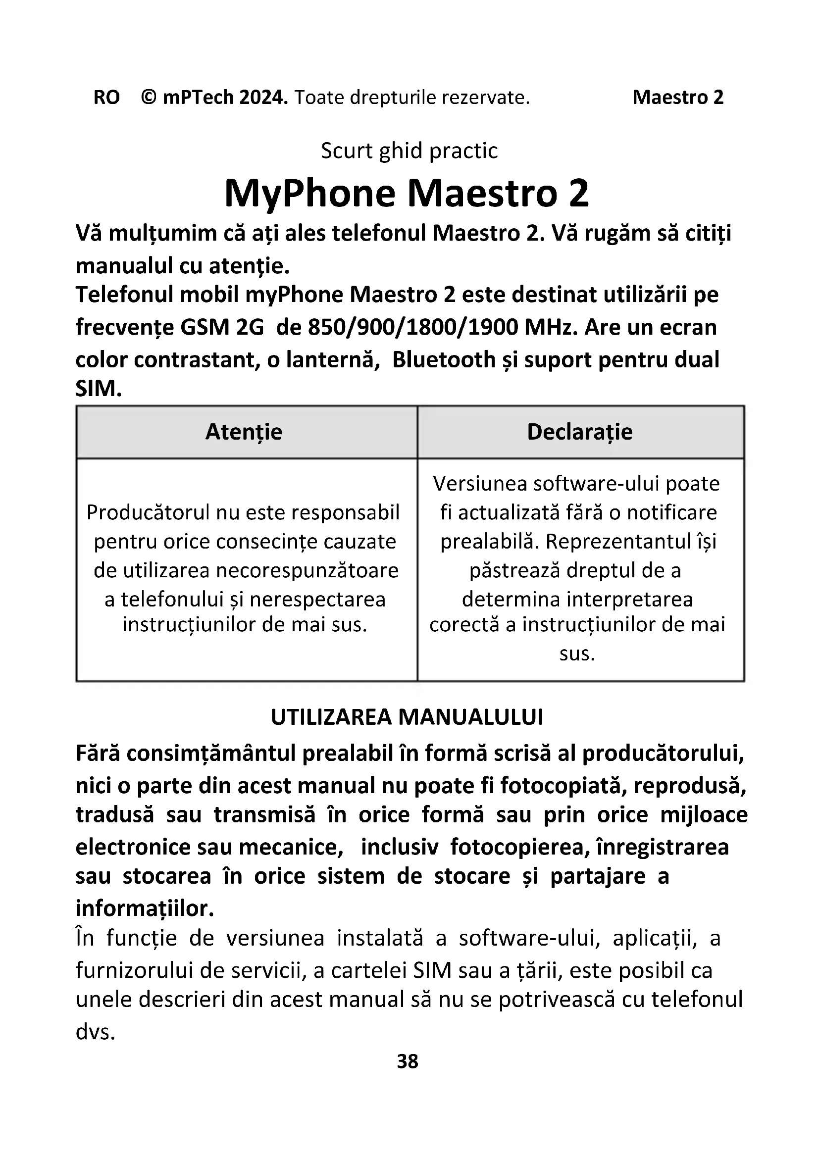 Scurt ghid practic MyPhone Maestro 2 Vă mulțumim că ați ales telefonul Maestro 2. Vă rugăm să citiți manualul cu atenție. Telefonul mobil myPhone Maestro 2 este destinat utilizării pe frecvențe GSM 2G de 850/900/1800/1900 MHz. Are un ecran color contrastant, o lanternă, Bluetooth și suport pentru dual SIM. Atenție Declarație Producătorul nu este responsabil pentru orice consecințe cauzate de utilizarea necorespunzătoare a telefonului și nerespectarea instrucțiunilor de mai sus. Versiunea software-ului poate fi actualizată fără o notificare prealabilă. Reprezentantul își păstrează dreptul de a determina interpretarea corectă a instrucțiunilor de mai sus. UTILIZAREA MANUALULUI Fără consimțământul prealabil în formă scrisă al producătorului, nici o parte din acest manual nu poate fi fotocopiată, reprodusă, tradusă sau transmisă în orice formă sau prin orice mijloace electronice sau mecanice, inclusiv fotocopierea, înregistrarea sau stocarea în orice sistem de stocare și partajare a informațiilor. În funcție de versiunea instalată a software-ului, aplicații, a furnizorului de servicii, a cartelei SIM sau a țării, este posibil ca unele descrieri din acest manual să nu se potrivească cu telefonul dvs.RO © mPTech 2024. Toate drepturile rezervate. Maestro 2