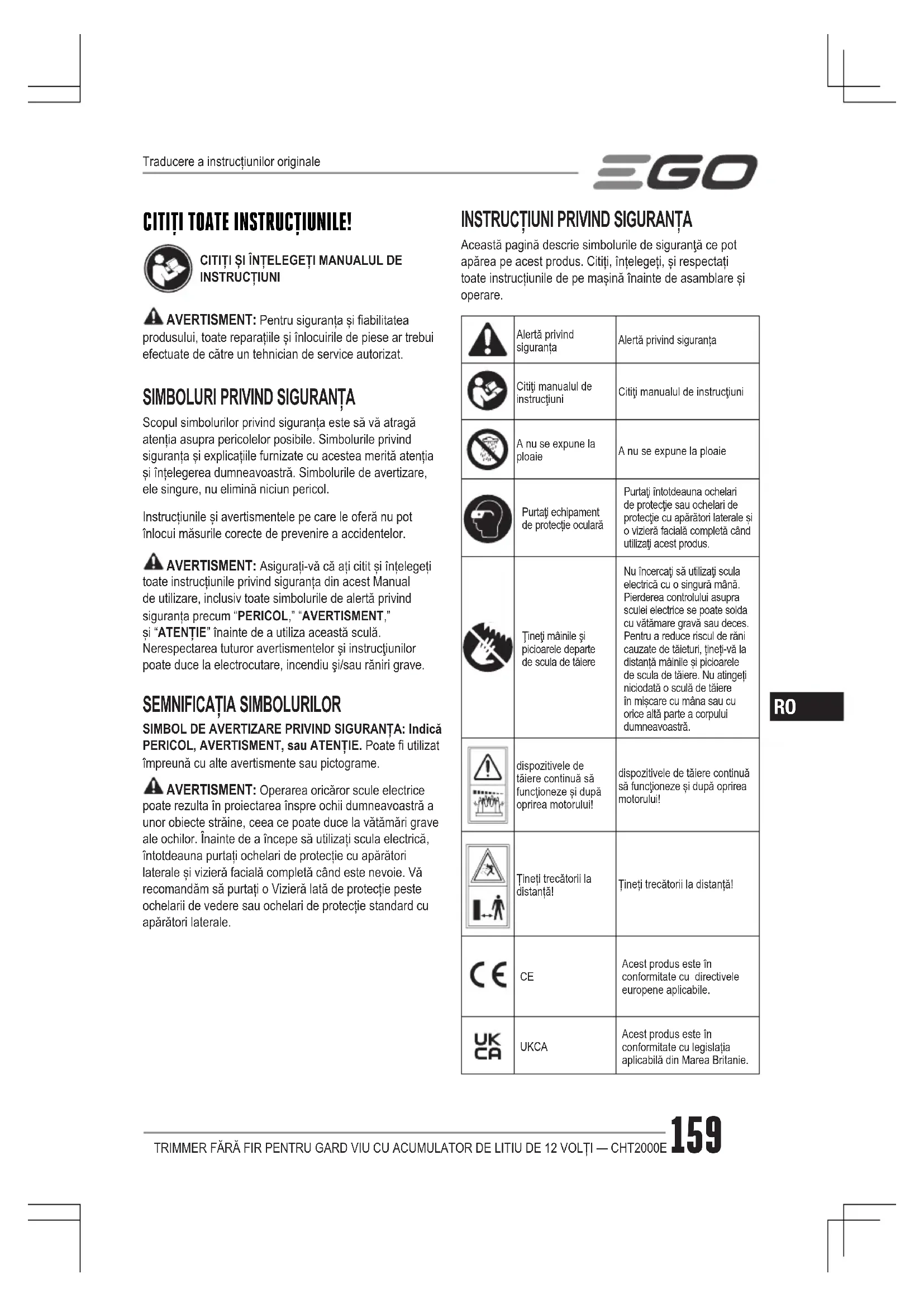 Această pagină descrie simbolurile de siguranţă ce pot apărea pe acest produs. Citiți, înțelegeți, și respectați toate instrucțiunile de pe mașină înainte de asamblare și operare.Alertă privind siguranțaAlertă privind siguranțaCitiţi manualul de instrucţiuniCitiţi manualul de instrucţiuniA nu se expune la ploaieA nu se expune la ploaiePurtaţi echipament de protecție ocularăPurtaţi întotdeauna ochelari de protecţie sau ochelari de protecţie cu apărători laterale și o vizieră facială completă când utilizaţi acest produs.Ţineţi mâinile şi picioarele departe de scula de tăiereNu încercaţi să utilizaţi scula electrică cu o singură mână. Pierderea controlului asupra sculei electrice se poate solda cu vătămare gravă sau deces. Pentru a reduce riscul de răni cauzate de tăieturi, țineți-vă la distanță mâinile și picioarele de scula de tăiere. Nu atingeți niciodată o sculă de tăiere în mișcare cu mâna sau cu orice altă parte a corpului dumneavoastră.dispozitivele de tăiere continuă să funcţioneze și după oprirea motorului!dispozitivele de tăiere continuă să funcţioneze și după oprirea motorului!Țineți trecătorii la distanță!Țineți trecătorii la distanță! Acest produs este în conformitate cu directivele europene aplicabile. UKCA Acest produs este în conformitate cu legislația aplicabilă din Marea Britanie.Traducere a instrucțiunilor originaleTRIMMER FĂRĂ FIR PENTRU GARD VIU CU ACUMULATOR DE LITIU DE 12 VOLȚI — CHT2000E160