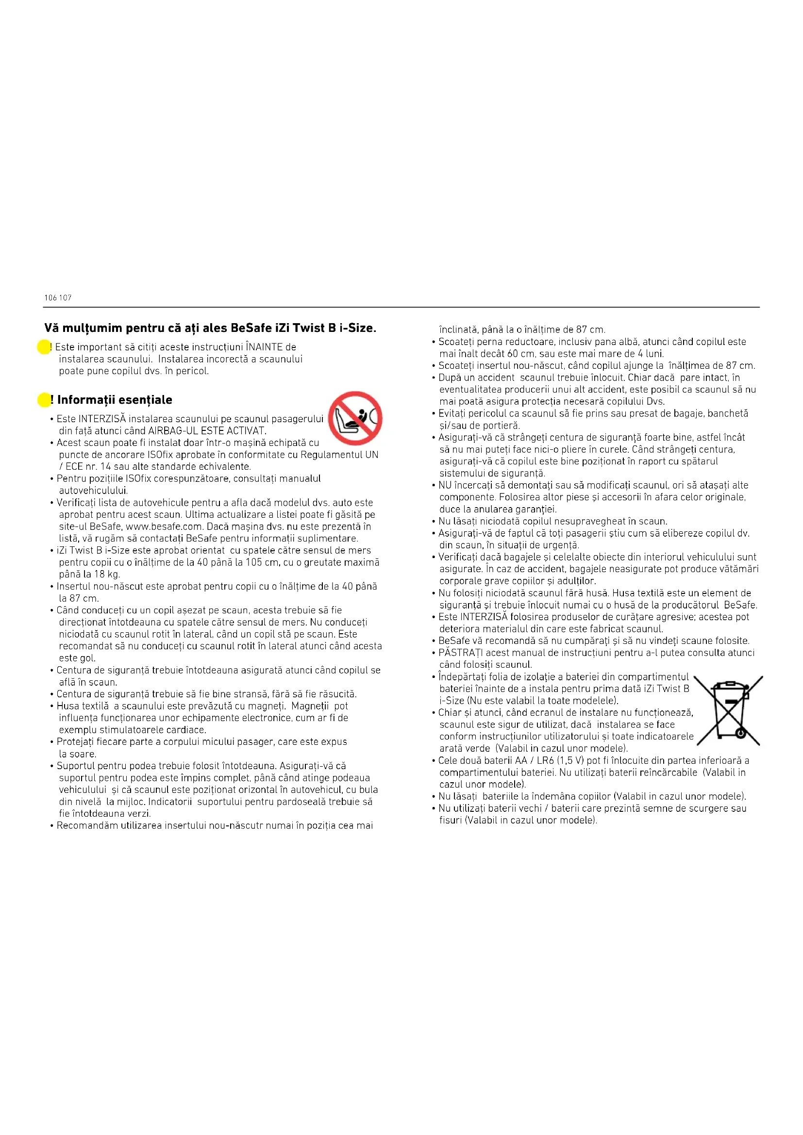 - Nu utilizați baterii vechi / baterii care prezintă semne de scurgere sau fisuri (Valabil in cazul unor modele). ! Este important să citiţi aceste instrucţiuni ÎNAINTE de instalarea scaunului. Instalarea incorectă a scaunului poate pune copilul dvs. în pericol. Vă mulţumim pentru că aţi ales BeSafe iZi Twist B i-Size.108 109