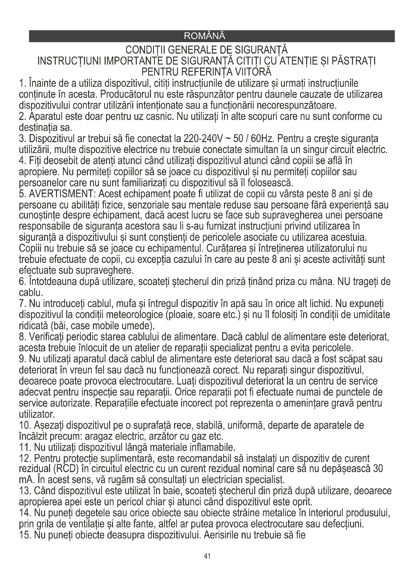 42. Nu utilizați dispozitivul acolo unde există riscul de condens. Umezeala se poate forma în