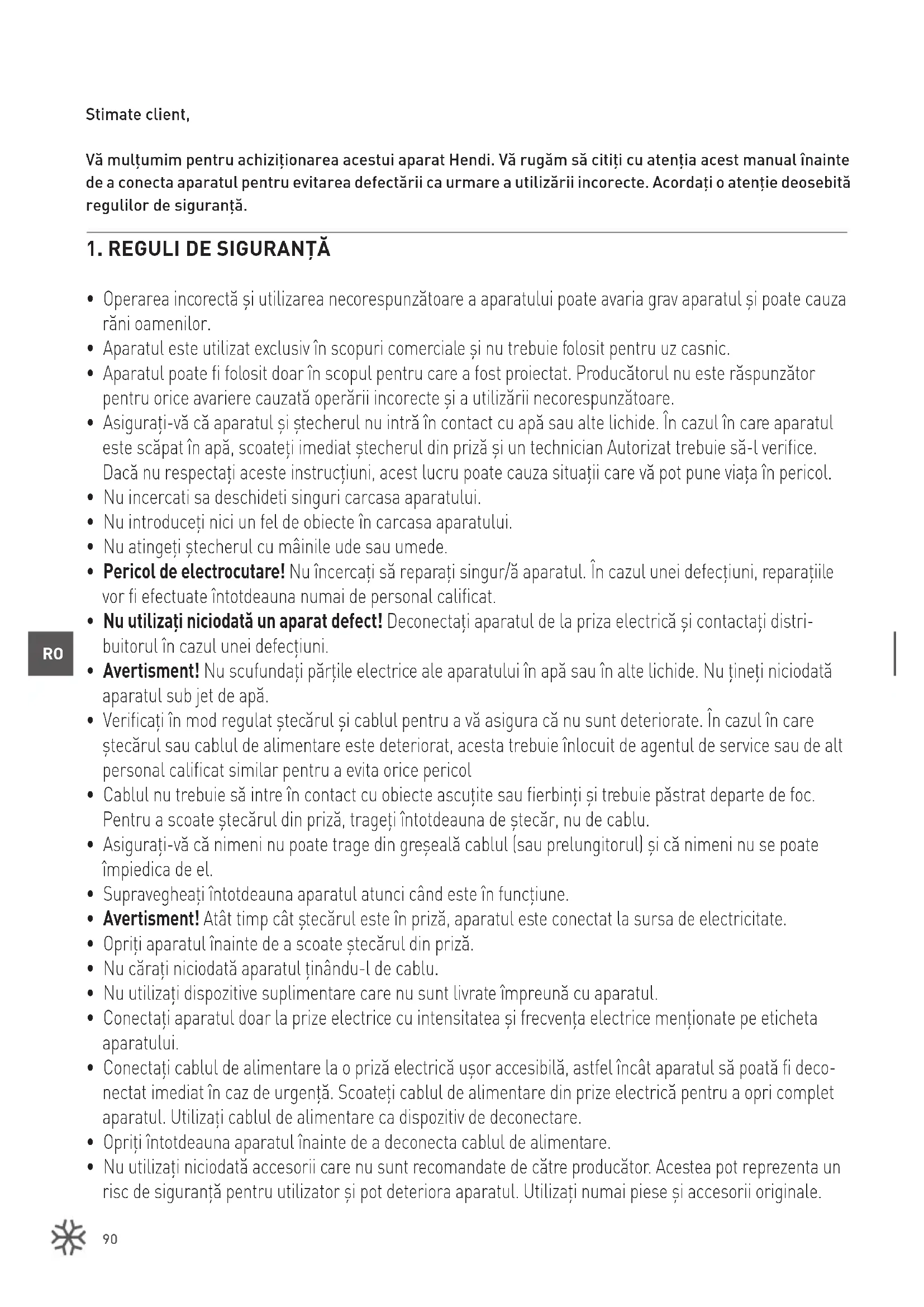 Stimate client, Vă mulțumim pentru achiziționarea acestui aparat Hendi. Vă rugăm să citiți cu atenția acest manual înainte de a conecta aparatul pentru evitarea defectării ca urmare a utilizării incorecte. Acordați o atenție deosebită regulilor de siguranță.