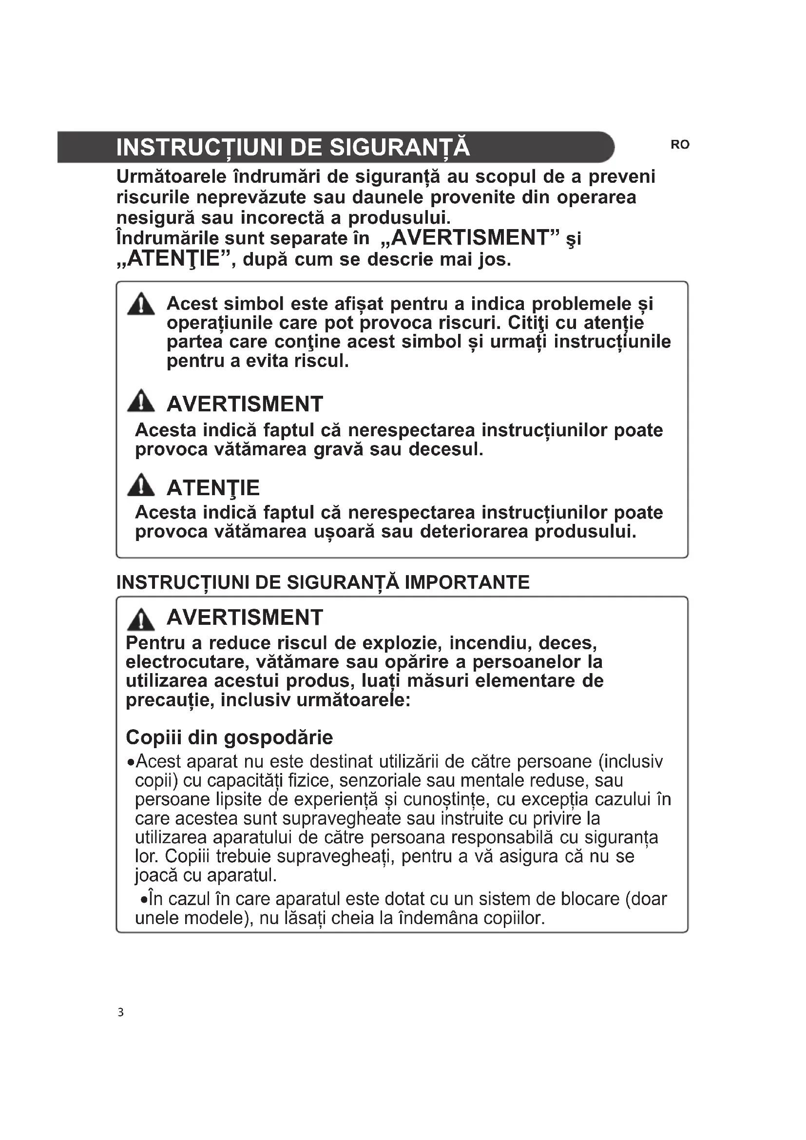 AVERTISMENT Pentru a reduce riscul de explozie, incendiu, deces, electrocutare, vătămare sau opărire a persoanelor la utilizarea acestui produs, luați măsuri elementare de precauție, inclusiv următoarele: Copiii din gospodărie