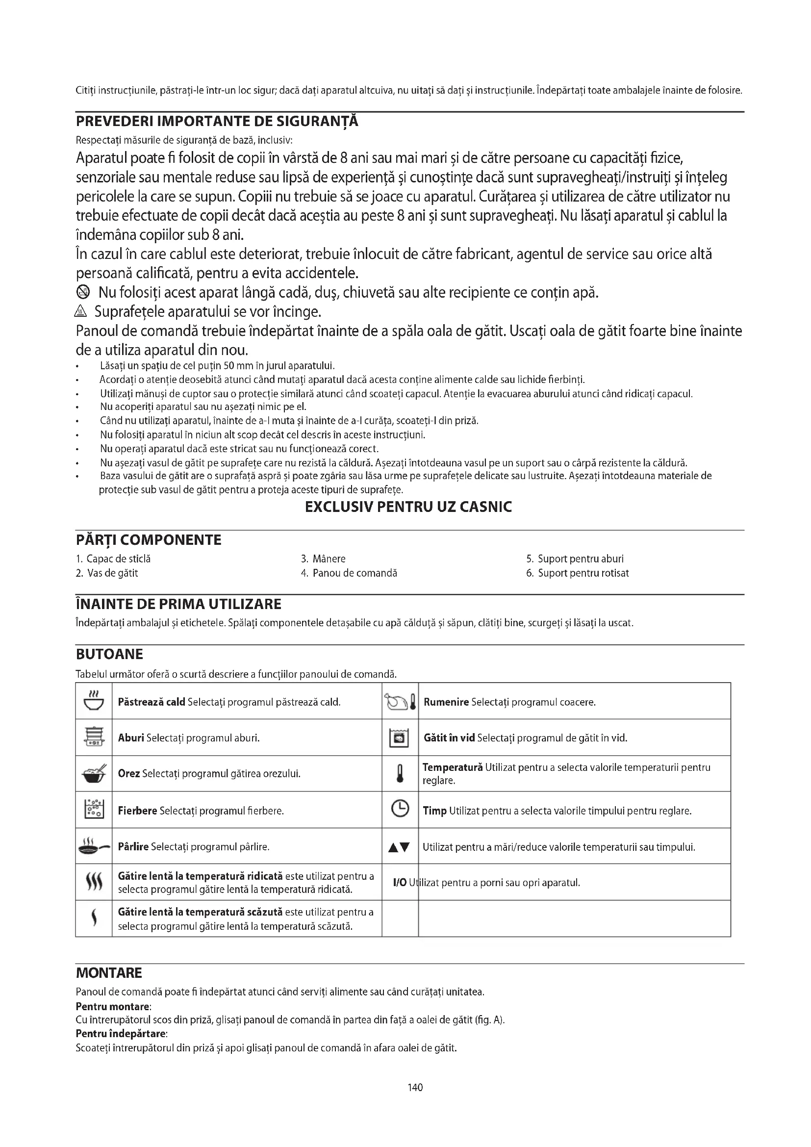 Îndepărtați ambalajul și etichetele. Spălați componentele detașabile cu apă călduță și săpun, clătiți bine, scurgeți și lăsați la uscat. BUTOANE Tabelul următor oferă o scurtă descriere a funcțiilor panoului de comandă. Păstrează cald Selectați programul păstrează cald. Rumenire Selectați programul coacere. Aburi Selectați programul aburi. Gătit în vid Selectați programul de gătit în vid. Orez Selectați programul gătirea orezului. Temperatură Utilizat pentru a selecta valorile temperaturii pentru reglare. Fierbere Selectați programul erbere. Timp Utilizat pentru a selecta valorile timpului pentru reglare. Pârlire Selectați programul pârlire. u d Utilizat pentru a mări/reduce valorile temperaturii sau timpului. Gătire lentă la temperatură ridicată este utilizat pentru a selecta programul gătire lentă la temperatură ridicată. I/O Utilizat pentru a porni sau opri aparatul. Gătire lentă la temperatură scăzută este utilizat pentru a selecta programul gătire lentă la temperatură scăzută. MONTARE Panoul de comandă poate îndepărtat atunci când serviți alimente sau când curățați unitatea. Pentru montare: Cu întrerupătorul scos din priză, glisați panoul de comandă în partea din față a oalei de gătit (g. A). Pentru îndepărtare: Scoateți întrerupătorul din priză și apoi glisați panoul de comandă în afara oalei de gătit.141