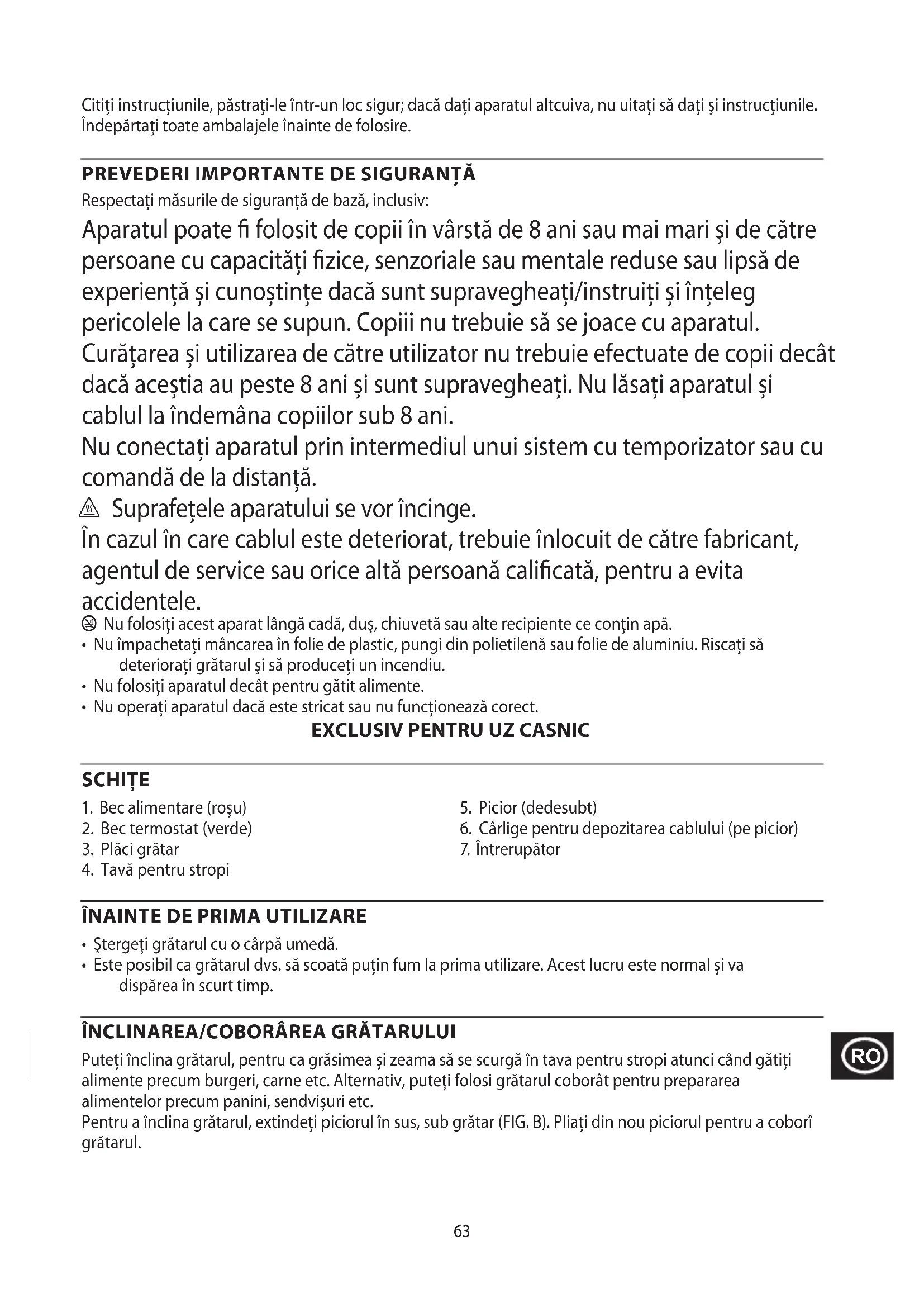 Respectaţi măsurile de siguranţă de bază, inclusiv: Aparatul poate folosit de copii în vârstă de 8 ani sau mai mari și de către persoane cu capacități zice, senzoriale sau mentale reduse sau lipsă de experiență și cunoștințe dacă sunt supravegheați/instruiți și înțeleg pericolele la care se supun. Copiii nu trebuie să se joace cu aparatul. Curățarea și utilizarea de către utilizator nu trebuie efectuate de copii decât dacă aceștia au peste 8 ani și sunt supravegheați. Nu lăsați aparatul și cablul la îndemâna copiilor sub 8 ani. Nu conectaţi aparatul prin intermediul unui sistem cu temporizator sau cu comandă de la distanţă. ¬ Suprafețele aparatului se vor încinge. În cazul în care cablul este deteriorat, trebuie înlocuit de către fabricant, agentul de service sau orice altă persoană calicată, pentru a evita accidentele. b Nu folosiţi acest aparat lângă cadă, duş, chiuvetă sau alte recipiente ce conţin apă.