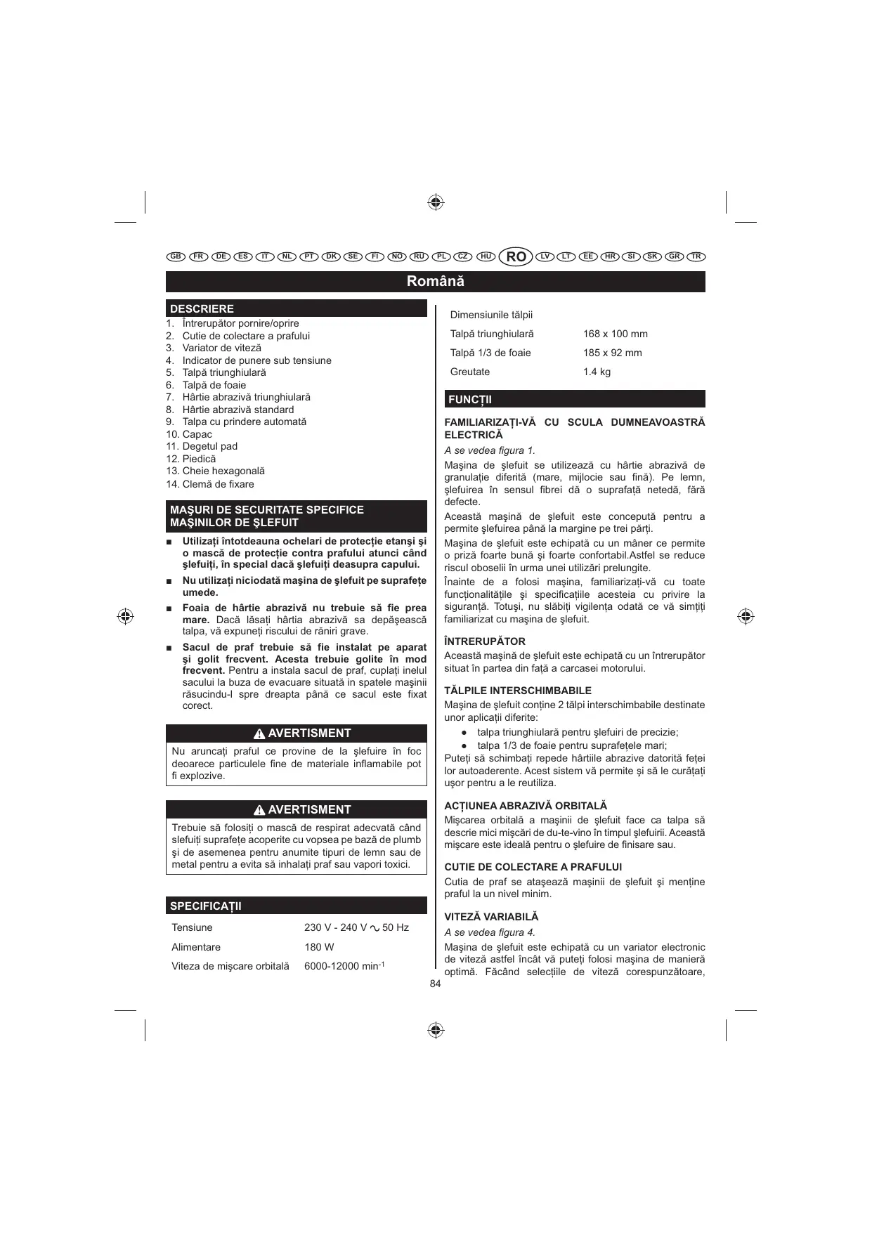 Ma¬ina de ¬lefuit conine 2 tlpi interschimbabile destinate unor aplicaii diferite: Ê talpa triunghiular pentru ¬lefuiri de precizie; Ê talpa 1/3 de foaie pentru suprafeele mari; Putei s schimbai repede hârtiile abrazive datorit feei lor autoaderente. Acest sistem v permite ¬i s le curai u¬or pentru a le reutiliza. AVERTISMENT Nu aruncai praful ce provine de la ¬lefuire în foc deoarece particulele Âne de materiale inÈamabile pot  explozive. ACğIUNEA ABRAZIV( ORBITAL( Mi¬carea orbital a ma¬inii de ¬lefuit face ca talpa s descrie mici mi¬cri de du-te-vino în timpul ¬lefuirii. Aceast mi¬care este ideal pentru o ¬lefuire de Ânisare sau. AVERTISMENT Trebuie s folosii o masc de respirat adecvat când slefuii suprafee acoperite cu vopsea pe baz de plumb ¬i de asemenea pentru anumite tipuri de lemn sau de metal pentru a evita s inhalai praf sau vapori toxici.