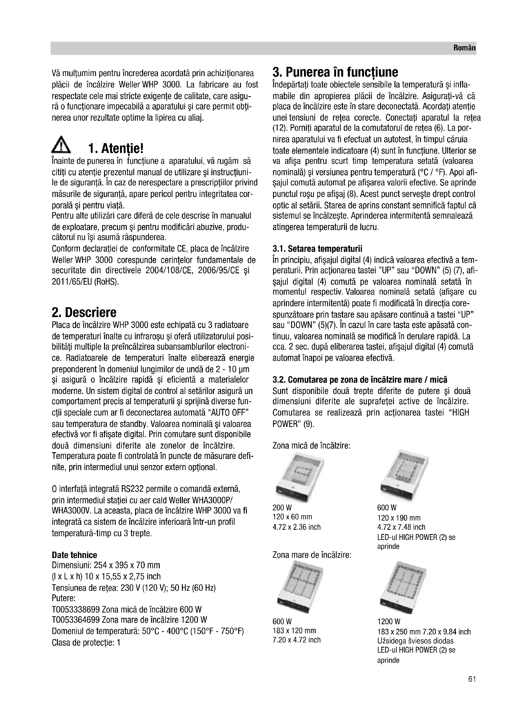 Vă mulţumim pentru încrederea acordată prin achiziţionarea plăcii de încălzire Weller WHP 3000. La fabricare au fost respectate cele mai stricte exigenţe de calitate, care asigu- ră o funcţionare impecabilă a aparatului şi care permit obţi- nerea unor rezultate optime la lipirea cu aliaj.