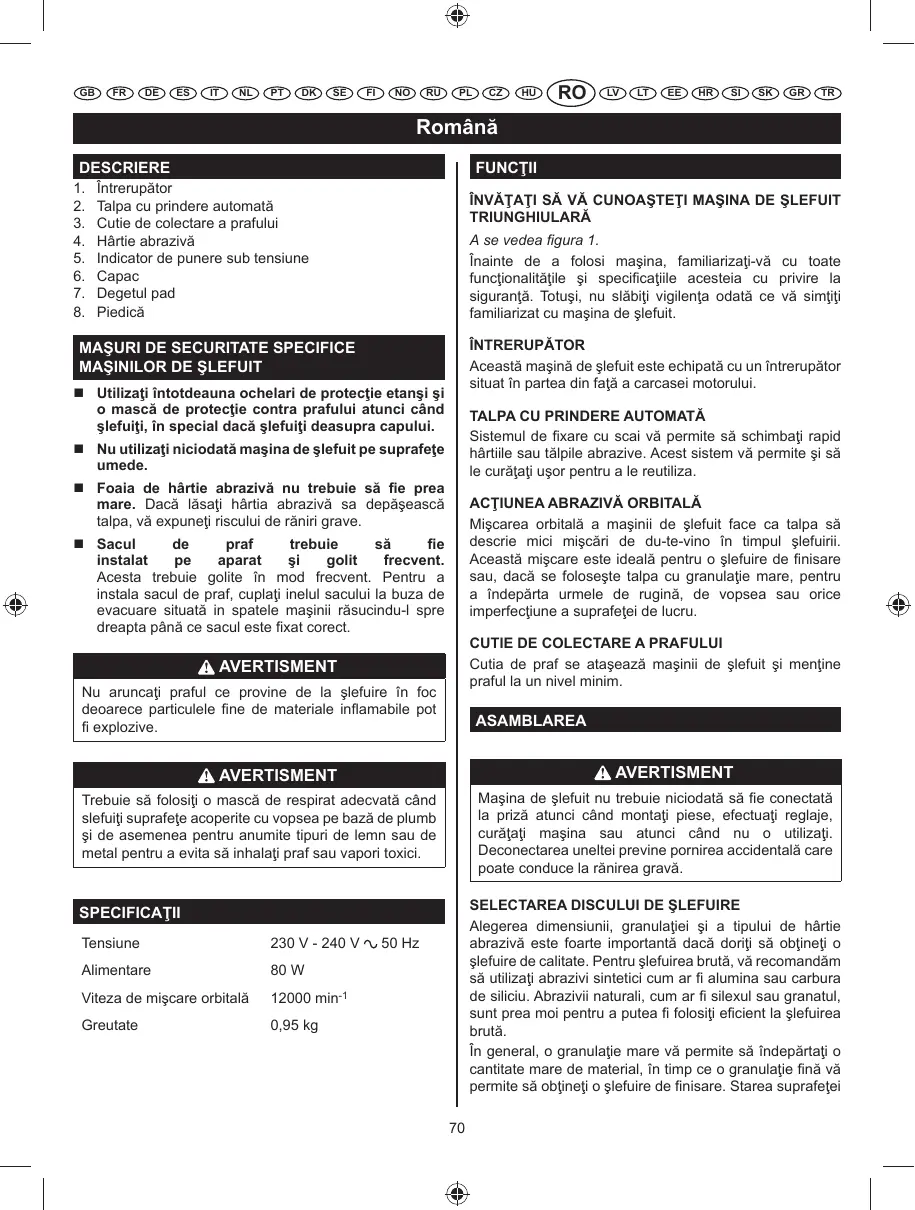 AVERTISMENT Nu aruncaţi praful ce provine de la şlefuire în foc deoarece particulele fine de materiale inflamabile pot fi explozive.