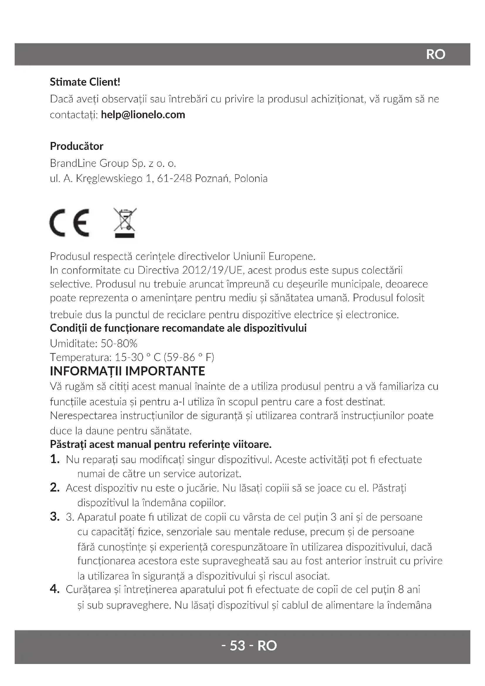 Smate Client! Dacă aveți observații sau întrebări cu privire la produsul achiziționat, vă rugăm să ne contactați: help@lionelo.com Producător BrandLine Group Sp. z o. o. ul. A. Kręglewskiego 1, 61-248 Poznań, Polonia Produsul respectă cerințele direcvelor Uniunii Europene. In conformitate cu Direcva 2012/19/UE, acest produs este supus colectării selecve. Produsul nu trebuie aruncat împreună cu deșeurile municipale, deoarece poate reprezenta o amenințare pentru mediu și sănătatea umană. Produsul folosit trebuie dus la punctul de reciclare pentru dispozive electrice și electronice. Condiții de funcționare recomandate ale dispozivului Umiditate: 50-80% Temperatura: 15-30 ° C (59-86 ° F)