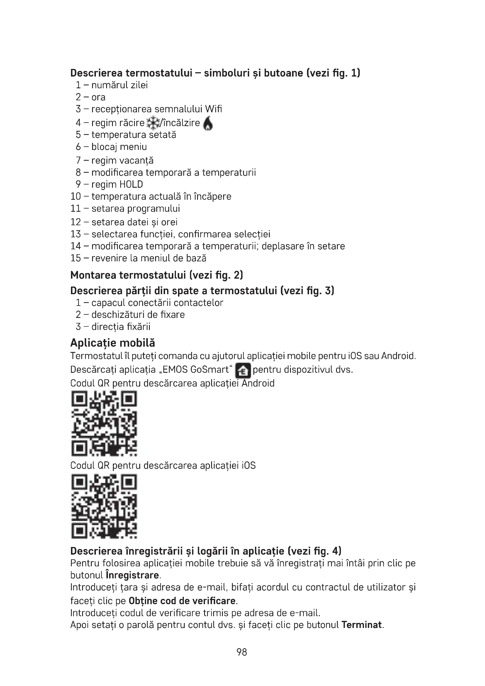 - Цей пристрій не призначений для користування особам (включно дітей), для котрих фізична, почуттєва чи розумова нездібність, чи не достаток досвіду та знань забороняє ним безпечно користуватися, якщо така особа не буде під доглядом, чи якщо не була проведена для неї інструктаж відносно корис- тування споживачем відповідною особою, котра відповідає за її безпечність. Необхідно дивитися за дітьми та забезпечити,щоб з пристроєм не гралися. ПОПЕРЕДЖЕННЯ: Зміст цього посібника може бути змінено без попереднього повідомлення – через обмежені можливості друку відображені символи можуть дещо відрізнятися від відображень на дисплеї – вміст цього посібника не можна відтворювати без згоди виробника. Не викидуйте електричні пристрої як несортовані комунальні відходи, користуйтесь місцями збору комунальних відходів. За актуальною ін- формацією про місця збору звертайтесь до установ за місцем прожи- вання. Якщо електричні присторої розміщені на місцях з відходами, то небезпечні речовини можуть проникати до підземних вод і дістатись до харчо- вого обігу та пошкоджувати ваше здоров‘я. Цим підприємство EMOS spol. sr. o. проголошує, що тип радіообладнання P56201 відповідає Директивам 2014/53/EU. Повний текст ЄС проголошення про відповідність можна знайти на цьому сайті http://www.emos.eu/download. RO|MD | Termostat Termostatul P56201 este destinat pentru comanda sistemelor termice și de climatizare. Avertizări importante Înainte de prima utilizare citiţi cu atenţie atât manualul de utilizare a termostatului, cât şi al cazanului sau instalaţiei de climatizare. Înainte de instalarea termostatului deconectaţi alimentarea cu curent electric! Recomandăm ca instalarea să e făcută de un lucrător calicat! La instalare respectaţi normele prescrise. Specicații tehnice: Sarcina conectată: max. 230 V AC; 6 A pentru sarcină rezistivă; 2 A pentru sarcină inductivă Măsurarea temperaturii: 0 °C la 40 °C cu rezoluția 0,1 °C; precizia ±1 °C la 20 °C Reglarea temperaturii: 5 °C la 35 °C în paşi de 0,5 °C Abaterea temperaturii reglate: 0,2 °C la 2 °C în paşi de 0,1 °C Temperatura de funcţionare: 0 °C la 40 °C Frecvența Wi: 2,4 GHz, 25 mW e.i.r.p. max. Alimentarea: 230 V AC/50 Hz Dimensiuni: 138 × 88 × 33 mm98 Descrierea termostatului – simboluri și butoane (vezi g. 1) 1 – numărul zilei 2 – ora 3 – recepționarea semnalului Wi 4 – regim răcire /încălzire 5 – temperatura setată 6 – blocaj meniu 7 – regim vacanță 8 – modicarea temporară a temperaturii 9 – regim HOLD 10 – temperatura actuală în încăpere 11 – setarea programului 12 – setarea datei și orei 13 – selectarea funcției, conrmarea selecției 14 – modicarea temporară a temperaturii; deplasare în setare 15 – revenire la meniul de bază Montarea termostatului (vezi g. 2) Descrierea părții din spate a termostatului (vezi g. 3) 1 – capacul conectării contactelor 2 – deschizături de xare 3 – direcția xării Aplicație mobilă Termostatul îl puteți comanda cu ajutorul aplicației mobile pentru iOS sau Android. Descărcați aplicația „EMOS GoSmart“ pentru dispozitivul dvs. Codul QR pentru descărcarea aplicației Android Codul QR pentru descărcarea aplicației iOS Descrierea înregistrării și logării în aplicație (vezi g. 4) Pentru folosirea aplicației mobile trebuie să vă înregistrați mai întâi prin clic pe butonul Înregistrare. Introduceți țara și adresa de e-mail, bifați acordul cu contractul de utilizator și faceți clic pe Obține cod de vericare. Introduceți codul de vericare trimis pe adresa de e-mail. Apoi setați o parolă pentru contul dvs. și faceți clic pe butonul Terminat.99 Potrivit chibzuinței dvs. bifați opțiunile Analiza datelor/Personalizare și faceți clic pe Accesarea aplicației. Interconectarea termostatului cu rețeaua wi pentru comanda prin aplicație mobilă (vezi g. 5) Apăsați lung butonul timp de cca 5 secunde. Apoi apăsați butonul timp de 3 secunde. Va așat E2 și va clipi simbolul . În aplicație faceți clic pe Adaugă dispozitiv, permiteți accesul la locație. Selectați detectarea manuală a dispozitivului Consumatoare casnice mici – Termostat (Wi-Fi) sau Altele – Altele (Wi-Fi). Selectați rețeaua de 2,4 GHz wi, introduceți parola și faceți clic pe Continuă. Bifați Conrmați că indicatorul clipește rapid și faceți clic pe Continuă. În 2 minute în aplicație se așează termostatul selectat. Faceți clic pe săgeata verde în dreapta, termostatul va adăugat în aplicație. Apoi faceți clic în aplicație pe simbolul termostatului, se așează meniul de comandă principal. Mențiune: Dacă asocierea termostatului eșuează, repetați întregul procedeu. Rețeaua wi 5 GHz nu este suportată. Prin aplicație se poate comanda termostatul de către max. 1 utilizator. Dacă doriți să comande termostatul alt utilizator, cel precedent trebuie să părăsească ap
