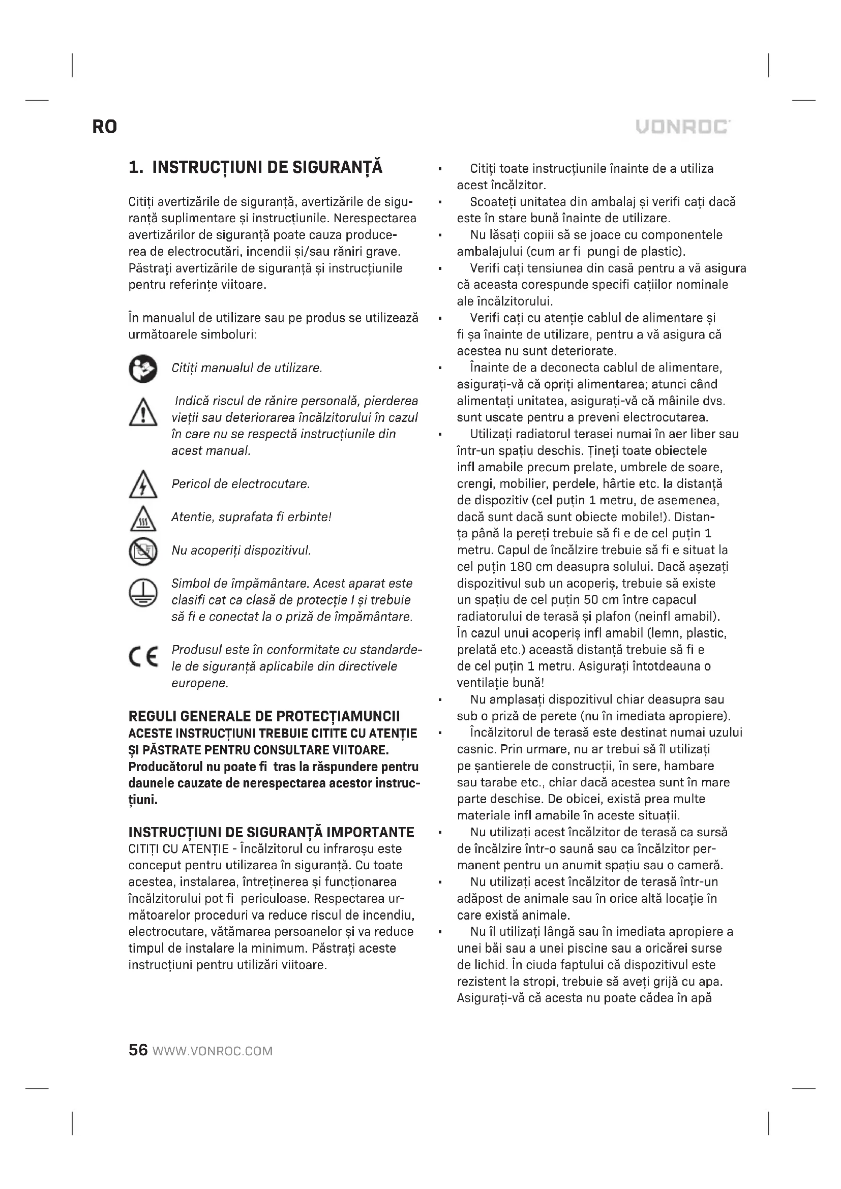 CITIȚI CU ATENȚIE - Încălzitorul cu infraroșu este conceput pentru utilizarea în siguranță. Cu toate acestea, instalarea, întreținerea și funcționarea încălzitorului pot fi periculoase. Respectarea ur- mătoarelor proceduri va reduce riscul de incendiu, electrocutare, vătămarea persoanelor și va reduce timpul de instalare la minimum. Păstrați aceste instrucțiuni pentru utilizări viitoare.
