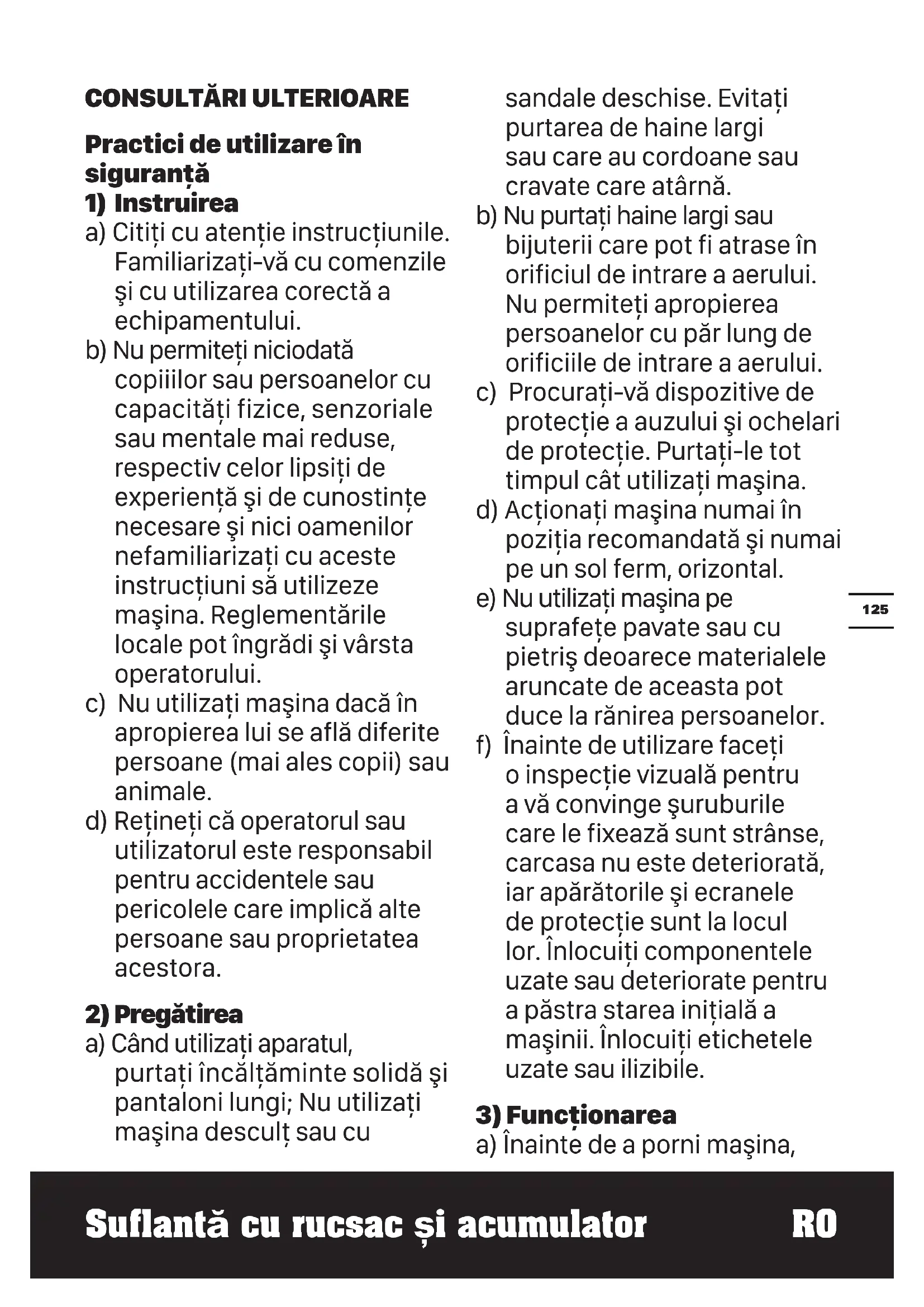 ACCUMULATOR a)Nu demontaţi, deschideţi sau rupeţi celulele sau acumulatorul. b)Nu scurtcircuitaţi un acumulator. Nu depozitaţi acumulatoarele la întâmplare într-o cutie sau într-un sertar unde s-ar putea scurtcircuita între ele sau prin materiale conductoare. Când acumulatorul nu este utilizat, ţineţi-l la distanţă de alte obiecte metalice, precum agrafele de birou, monede, chei, cuie, şuruburi sau alte obiecte metalice mici, care pot crea contact între cele două borne. Scurtcircuitarea bornelor acumulatorului poate cauza arsuri sau incendii. c)Nu expuneţi acumulatorul la căldură sau foc. Evitaţi depozitarea în lumina directă a soarelui. d)Nu supuneţi acumulatorul la şocuri mecanice. e)În cazul scurgerii128 SuflantĆ cu rucsac ʞi acumulator RO acumulatorului, aveţi grijă ca lichidul să nu intre în contact cu pielea sau ochii. În cazul contactului, spălaţi zona afectată cu apă din belşug şi solicitaţi asistenţă medicală. f) Menţineţi acumulatorul curat şi uscat. g)Ştergeţi bornele acumulatorului cu o cârpă curată şi uscată dacă se murdăresc. h)Acumulatorul trebuie încărcat înainte de utilizare. Consultaţi întotdeauna aceste instrucţiuni şi utilizaţi procedura de încărcare corectă.