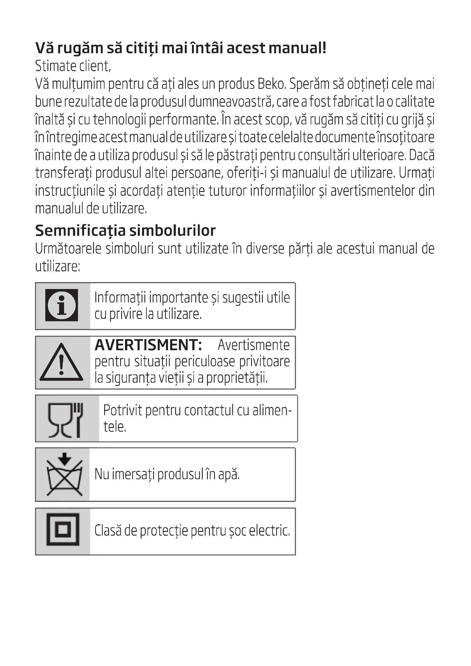 Prima di contattare l’assistenza tecnica, al fine di agevolare la gestione della chiamata, è necessario avere a portata di mano il modello del prodotto e il documento fiscale di acquisto.Vă rugăm să citiți mai întâi acest manual! Stimate client, Vă mulțumim pentru că ați ales un produs Beko. Sperăm să obțineți cele mai bune rezultate de la produsul dumneavoastră, care a fost fabricat la o calitate înaltă și cu tehnologii performante. În acest scop, vă rugăm să citiți cu grijă și în întregime acest manual de utilizare și toate celelalte documente însoțitoare înainte de a utiliza produsul și să le păstrați pentru consultări ulterioare. Dacă transferați produsul altei persoane, oferiți-i și manualul de utilizare. Urmați instrucțiunile și acordați atenție tuturor informațiilor și avertismentelor din manualul de utilizare. Semnificația simbolurilor Următoarele simboluri sunt utilizate în diverse părți ale acestui manual de utilizare: