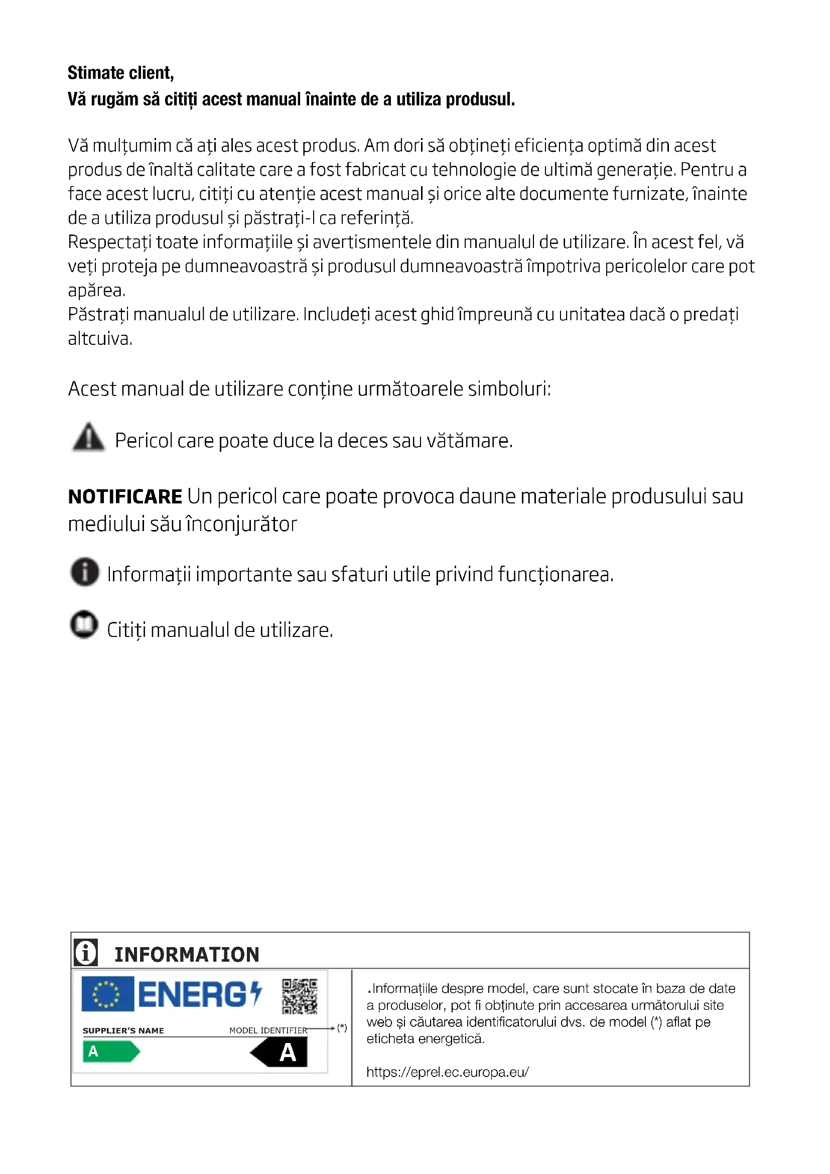 58 5583 0000/AE RO 2/2 GN163240ZXBRNStimate client, Vă rugăm să citiți acest manual înainte de a utiliza produsul. Vă mulţumim că aţi ales acest produs. Am dori să obţineţi eficienţa optimă din acest produs de înaltă calitate care a fost fabricat cu tehnologie de ultimă generaţie. Pentru a face acest lucru, citiţi cu atenţie acest manual și orice alte documente furnizate, înainte de a utiliza produsul și păstraţi-l ca referinţă. Respectaţi toate informaţiile și avertismentele din manualul de utilizare. În acest fel, vă veţi proteja pe dumneavoastră și produsul dumneavoastră împotriva pericolelor care pot apărea. Păstraţi manualul de utilizare. Includeţi acest ghid împreună cu unitatea dacă o predaţi altcuiva. Acest manual de utilizare conţine următoarele simboluri: Pericol care poate duce la deces sau vătămare. NOTIFICARE Un pericol care poate provoca daune materiale produsului sau mediului său înconjurător Informaţii importante sau sfaturi utile privind funcţionarea. Citiţi manualul de utilizare. .Informațiile despre model, care sunt stocate în baza de date a produselor, pot fi obținute prin accesarea următorului site web și căutarea identificatorului dvs. de model (*) aflat pe eticheta energetică.https://eprel.ec.europa.eu/