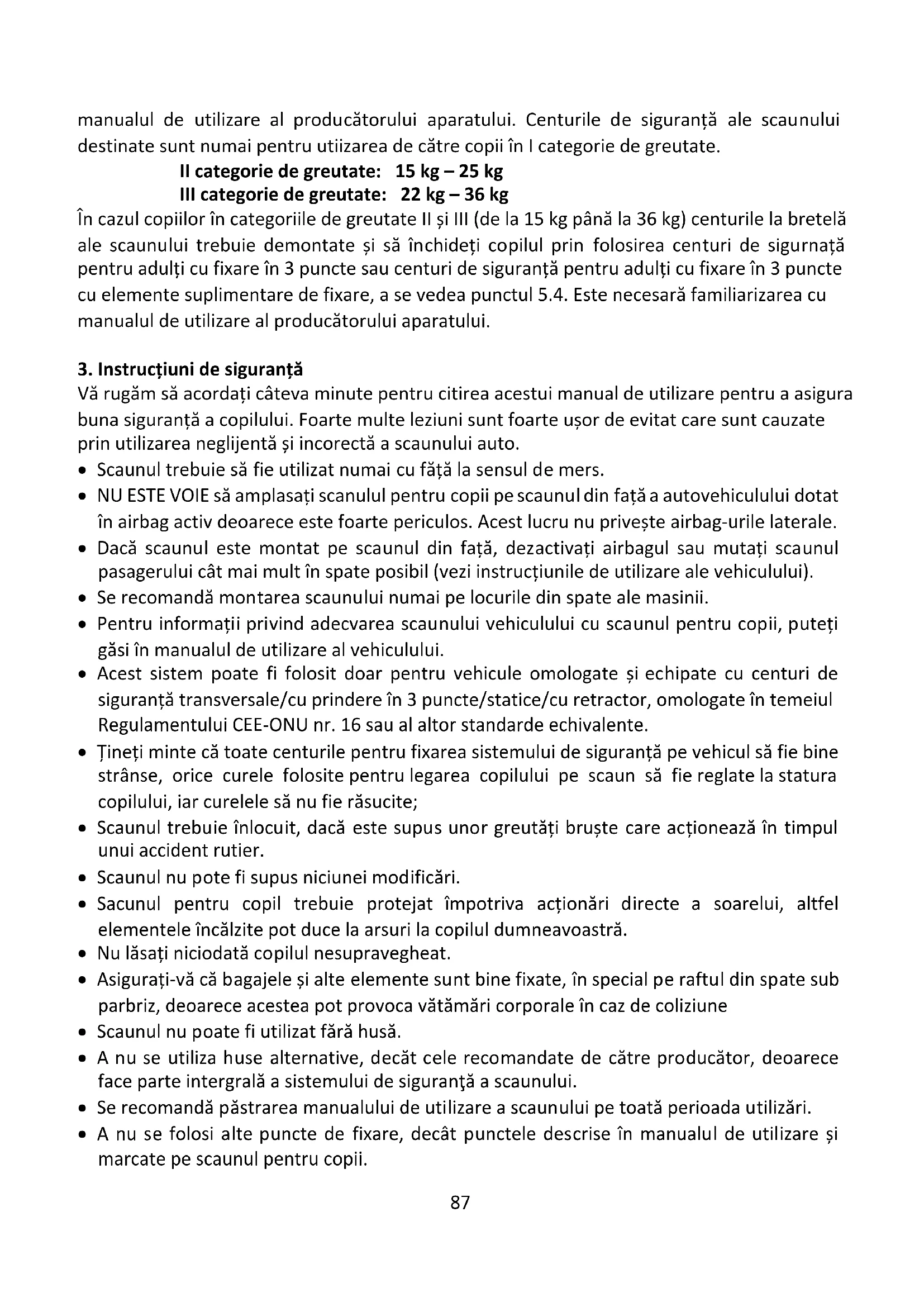 Scaunul este destinat pentru copii în categoriia de greutate de la I până la III deci cu o greutate între 9 kg și 36 kg (de la aprox. 9 luni până la vârsta de 11 ani). I categorie de greutate: 9 kg – 18 kg În sistemul de fixare ISOFIX și centuri superioare de fixare. Este necesară familiarizarea cu87 manualul de utilizare al producătorului aparatului. Centurile de siguranță ale scaunului destinate sunt numai pentru utiizarea de către copii în I categorie de greutate. II categorie de greutate: 15 kg – 25 kg III categorie de greutate: 22 kg – 36 kg În cazul copiilor în categoriile de greutate II și III (de la 15 kg până la 36 kg) centurile la bretelă ale scaunului trebuie demontate și să închideți copilul prin folosirea centuri de sigurnață pentru adulți cu fixare în 3 puncte sau centuri de siguranță pentru adulți cu fixare în 3 puncte cu elemente suplimentare de fixare, a se vedea punctul 5.4. Este necesară familiarizarea cu manualul de utilizare al producătorului aparatului.