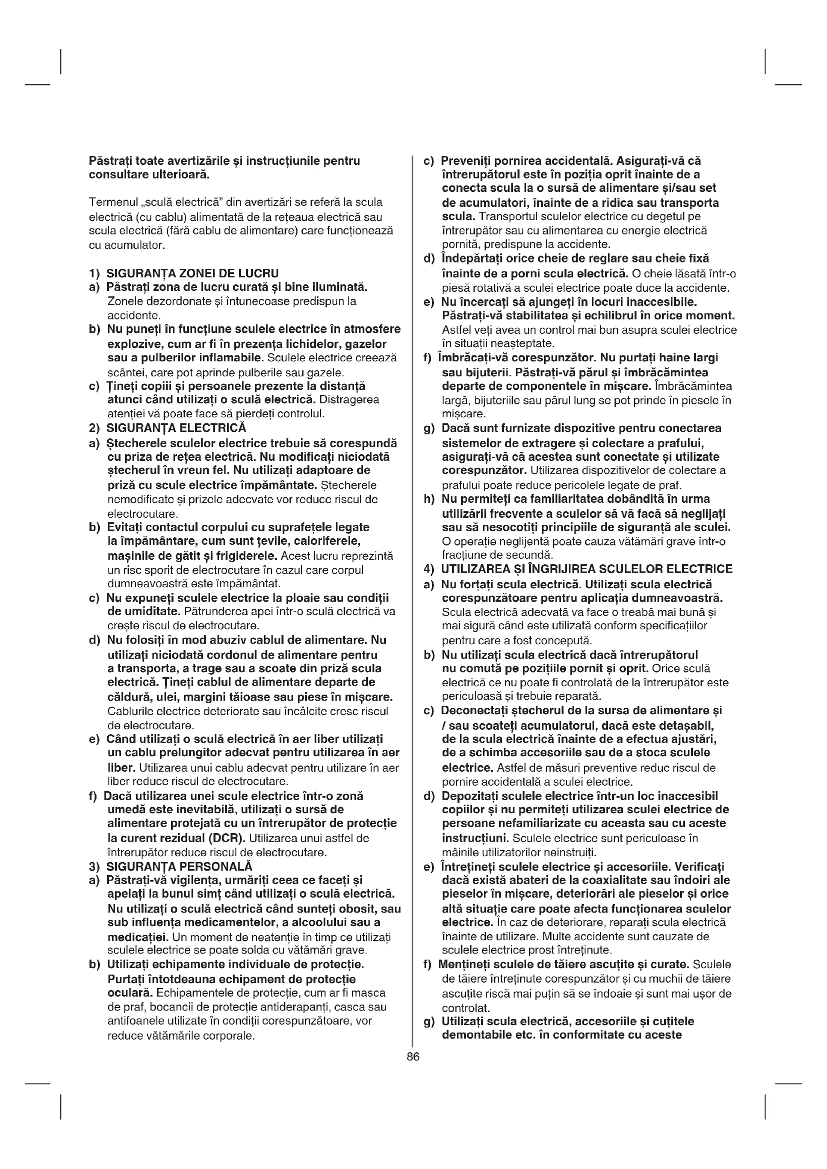 - Το επίπεδο μετάδοσης δόνησης έχει μετρηθεί σύμφωνα με τυποποιημένη δοκιμή κατά το πρότυπο EN 62841.86 c) Preveniţi pornirea accidentală. Asiguraţi-vă că întrerupătorul este în poziţia oprit înainte de a conecta scula la o sursă de alimentare și/sau set de acumulatori, înainte de a ridica sau transporta scula. Transportul sculelor electrice cu degetul pe întrerupător sau cu alimentarea cu energie electrică pornită, predispune la accidente. d) Îndepărtaţi orice cheie de reglare sau cheie xă înainte de a porni scula electrică. O cheie lăsată într-o piesă rotativă a sculei electrice poate duce la accidente. e) Nu încercaţi să ajungeţi în locuri inaccesibile. Păstraţi-vă stabilitatea și echilibrul în orice moment. Astfel veţi avea un control mai bun asupra sculei electrice în situaţii neașteptate. f) Îmbrăcaţi-vă corespunzător. Nu purtaţi haine largi sau bijuterii. Păstraţi-vă părul și îmbrăcămintea departe de componentele în mișcare. Îmbrăcămintea largă, bijuteriile sau părul lung se pot prinde în piesele în mișcare. g) Dacă sunt furnizate dispozitive pentru conectarea sistemelor de extragere și colectare a prafului, asiguraţi-vă că acestea sunt conectate și utilizate corespunzător. Utilizarea dispozitivelor de colectare a prafului poate reduce pericolele legate de praf. h) Nu permiteţi ca familiaritatea dobândită în urma utilizării frecvente a sculelor să vă facă să neglijaţi sau să nesocotiţi principiile de siguranţă ale sculei. O operaţie neglijentă poate cauza vătămări grave într-o fracţiune de secundă.