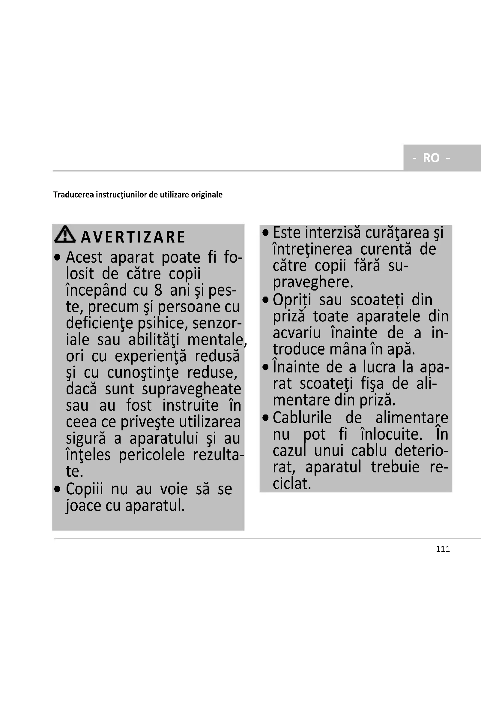 Este interzisă curăţarea şi întreţinerea curentă de către copii fără su- praveghere.