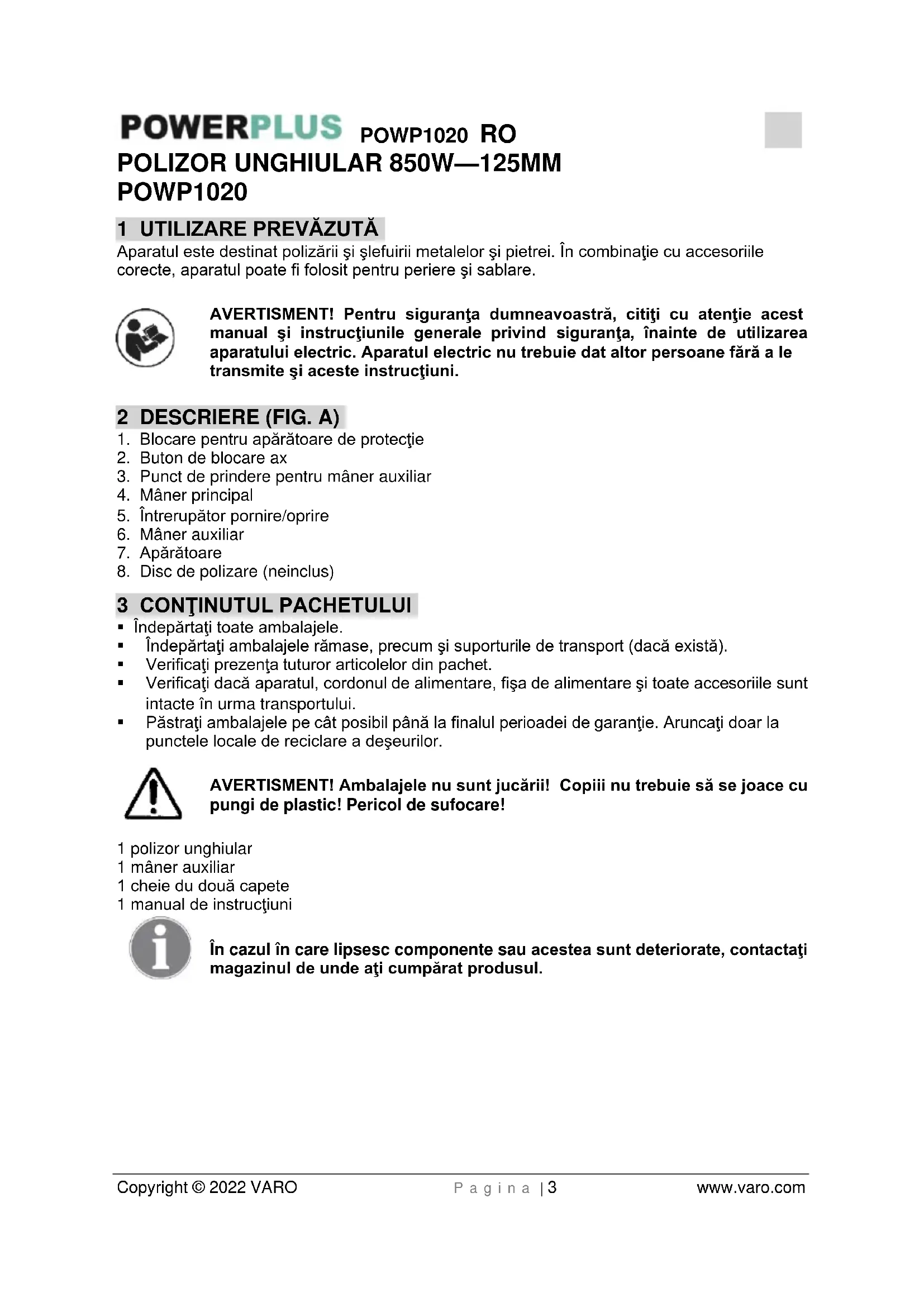- Reparaţi aparatul la un tehnician autorizat, folosind doar piese de schimb standard. Astfel, se va păstra siguranţa în funcţionare a aparatului.POWP1020 RO Copyright © 2022 VARO P a g i n a | 6 www.varo.com