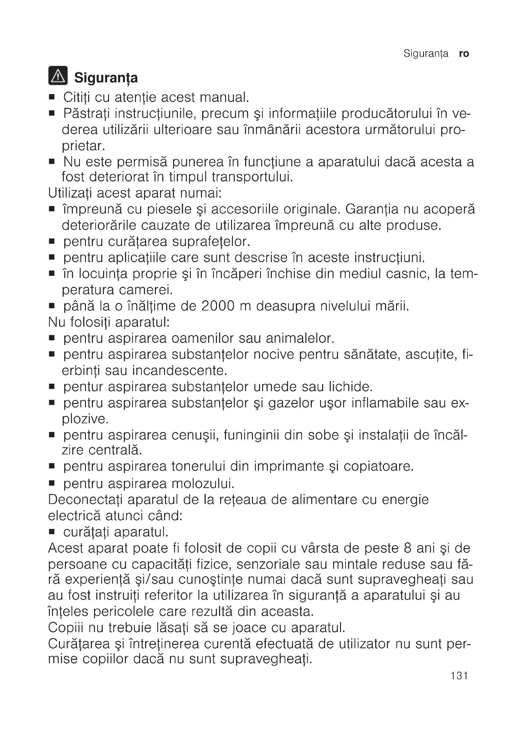 Siguranţa ¡ Citiţi cu atenţie acest manual. ¡ Păstraţi instrucţiunile, precum şi informaţiile producătorului în ve- derea utilizării ulterioare sau înmânării acestora următorului pro- prietar. ¡ Nu este permisă punerea în funcţiune a aparatului dacă acesta a fost deteriorat în timpul transportului. Utilizaţi acest aparat numai: ¡ împreună cu piesele şi accesoriile originale. Garanţia nu acoperă deteriorările cauzate de utilizarea împreună cu alte produse. ¡ pentru curăţarea suprafeţelor. ¡ pentru aplicaţiile care sunt descrise în aceste instrucţiuni. ¡ în locuinţa proprie şi în încăperi închise din mediul casnic, la tem- peratura camerei. ¡ până la o înălţime de 2000m deasupra nivelului mării. Nu folosiţi aparatul: ¡ pentru aspirarea oamenilor sau animalelor. ¡ pentru aspirarea substanţelor nocive pentru sănătate, ascuţite, fi- erbinţi sau incandescente. ¡ pentur aspirarea substanţelor umede sau lichide. ¡ pentru aspirarea substanţelor şi gazelor uşor inflamabile sau ex- plozive. ¡ pentru aspirarea cenuşii, funinginii din sobe şi instalaţii de încăl- zire centrală. ¡ pentru aspirarea tonerului din imprimante şi copiatoare. ¡ pentru aspirarea molozului. Deconectaţi aparatul de la reţeaua de alimentare cu energie electrică atunci când: ¡ curăţaţi aparatul. Acest aparat poate fi folosit de copii cu vârsta de peste 8 ani şi de persoane cu capacităţi fizice, senzoriale sau mintale reduse sau fă- ră experienţă şi/sau cunoştinţe numai dacă sunt supravegheaţi sau au fost instruiţi referitor la utilizarea în siguranţă a aparatului şi au înţeles pericolele care rezultă din aceasta. Copiii nu trebuie lăsaţi să se joace cu aparatul. Curăţarea şi întreţinerea curentă efectuată de utilizator nu sunt per- mise copiilor dacă nu sunt supravegheaţi.ro Siguranţa