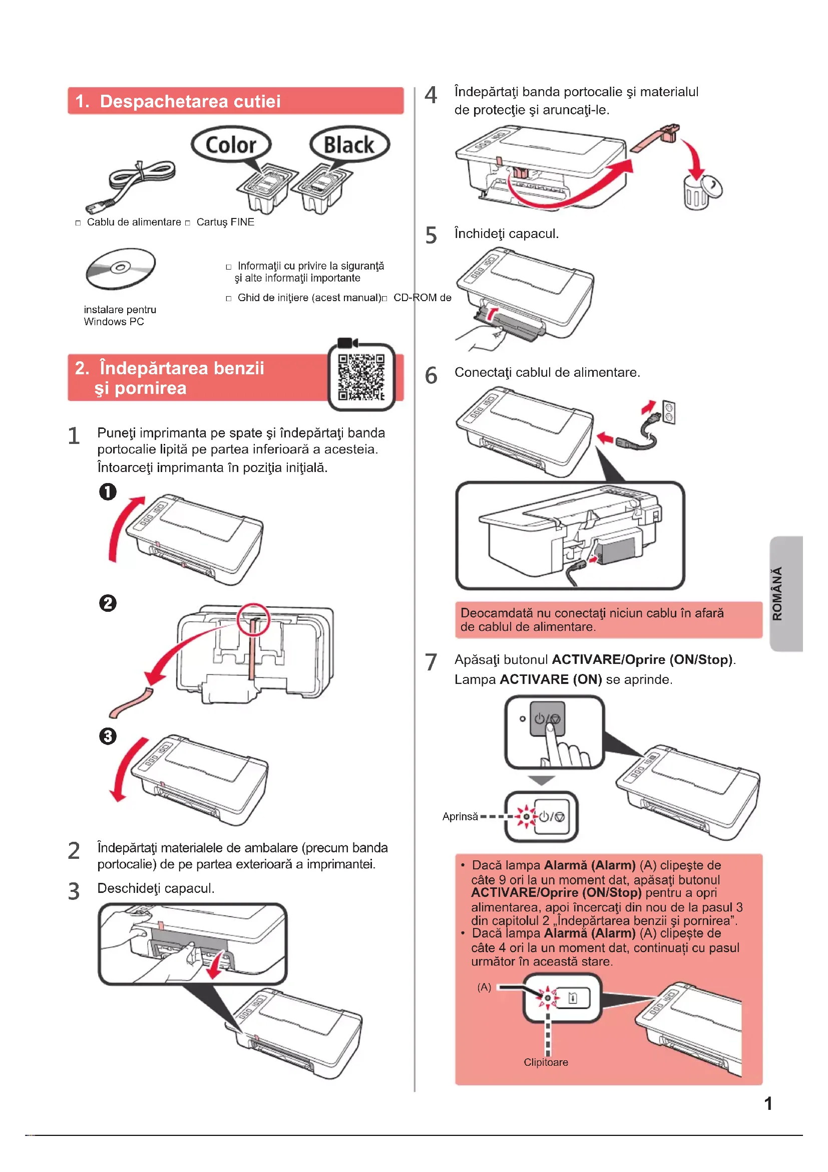 □ Cablu de alimentare □ Cartuş FINE□ Informaţii cu privire la siguranţă şi alte informaţii importante□ Ghid de iniţiere (acest manual)□ CD-ROM de instalare pentru Windows PC