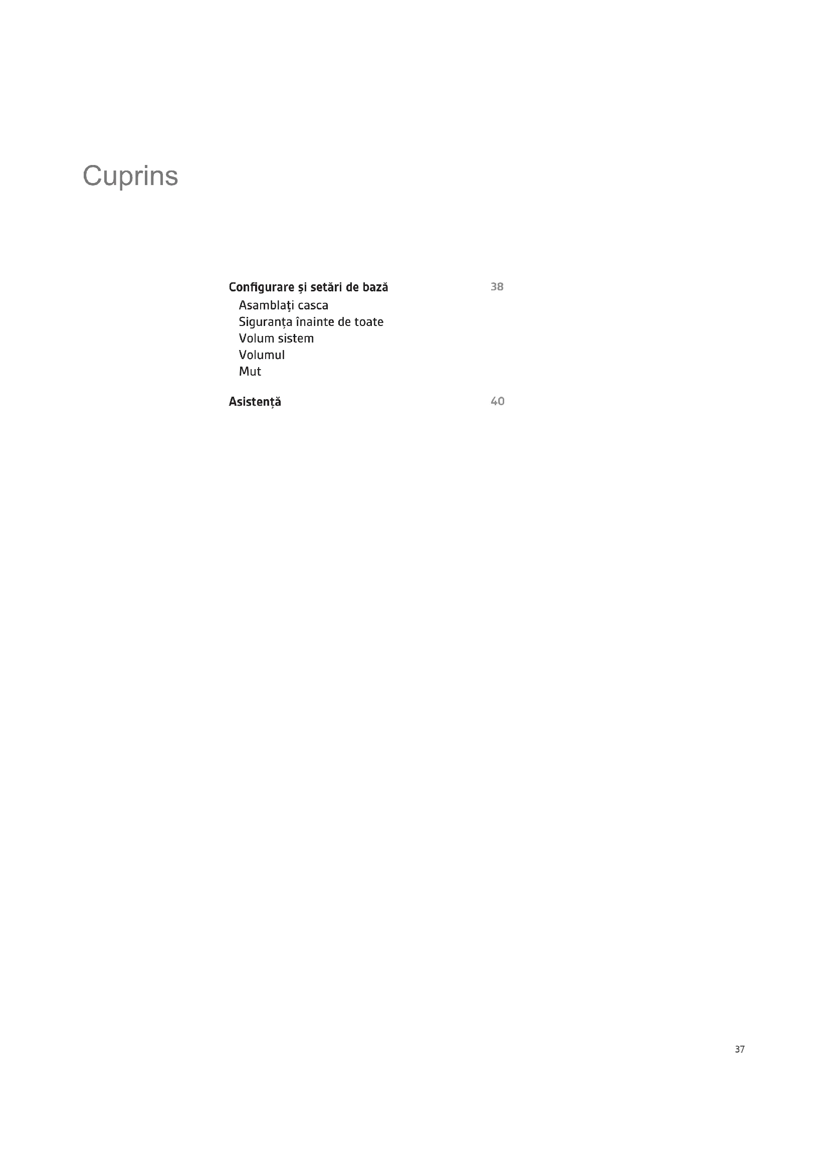 Asistenţă38 Congurare şi setări de bază Asamblaţi casca Componentele căştii pot xate cu uşurinţă pe cadrul căştilor pentru a congura cel mai bun sunet şi pentru cea mai bună xare. Urmaţi diagrama pentru a asambla căştile. Căştile se reglează pe trei dimeniuni (mică, medie şi mare) prin schimbarea pernuţelor pentru urechi. Pentru a scoate pernuţele, apăsaţi pe acestea pentru a le scoate de pe căşti. Citiţi ghidul cu instrucţiuni de siguranţă pentru informaţii importante privind siguranţa, încărcarea, bateria şi normele înainte de a utiliza casca. Pentru reglarea volumului, consultaţi ghidul de utilizarea a consolei Siguranţa înainte de toate Volum sistem
