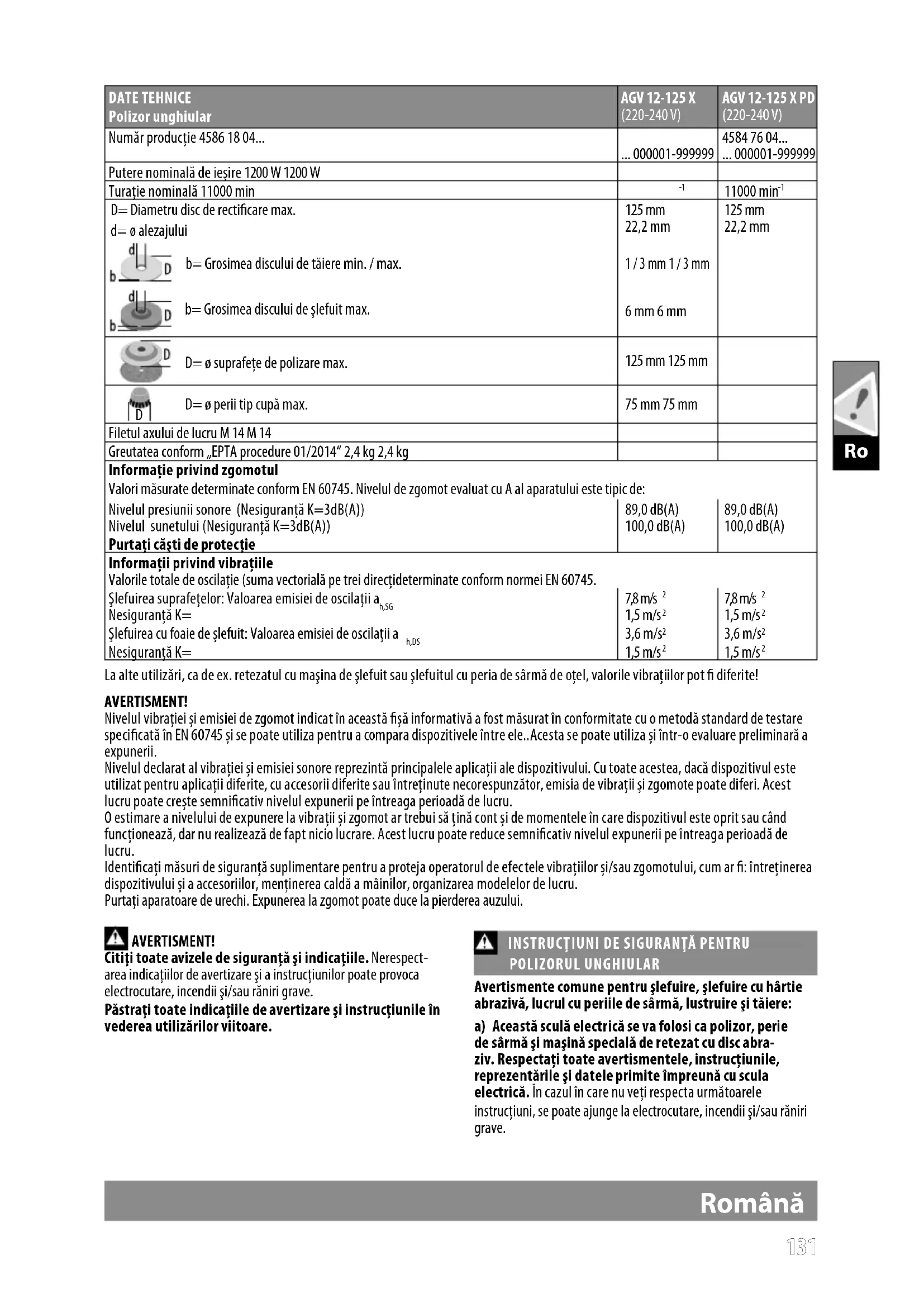 La alte utilizări, ca de ex. retezatul cu maşina de şlefuit sau şlefuitul cu peria de sârmă de oţel, valorile vibraţiilor pot diferite! AVERTISMENT! Nivelul vibrației și emisiei de zgomot indicat în această șă informativă a fost măsurat în conformitate cu o metodă standard de testare specicată în EN 60745 și se poate utiliza pentru a compara dispozitivele între ele..Acesta se poate utiliza și într-o evaluare preliminară a expunerii. Nivelul declarat al vibrației și emisiei sonore reprezintă principalele aplicații ale dispozitivului. Cu toate acestea, dacă dispozitivul este utilizat pentru aplicații diferite, cu accesorii diferite sau întreținute necorespunzător, emisia de vibrații și zgomote poate diferi. Acest lucru poate crește semnicativ nivelul expunerii pe întreaga perioadă de lucru. O estimare a nivelului de expunere la vibrații și zgomot ar trebui să țină cont și de momentele în care dispozitivul este oprit sau când funcționează, dar nu realizează de fapt nicio lucrare. Acest lucru poate reduce semnicativ nivelul expunerii pe întreaga perioadă de lucru. Identicați măsuri de siguranță suplimentare pentru a proteja operatorul de efectele vibrațiilor și/sau zgomotului, cum ar : întreținerea dispozitivului și a accesoriilor, menținerea caldă a mâinilor, organizarea modelelor de lucru. Purtaţi aparatoare de urechi. Expunerea la zgomot poate duce la pierderea auzului. AVERTISMENT! Citiţi toate avizele de siguranţă şi indicaţiile. Nerespect- area indicaţiilor de avertizare şi a instrucţiunilor poate provoca electrocutare, incendii şi/sau răniri grave. Păstraţ i toate indicaţiile de avertizare şi instrucţiunile în vederea utilizărilor viitoare.