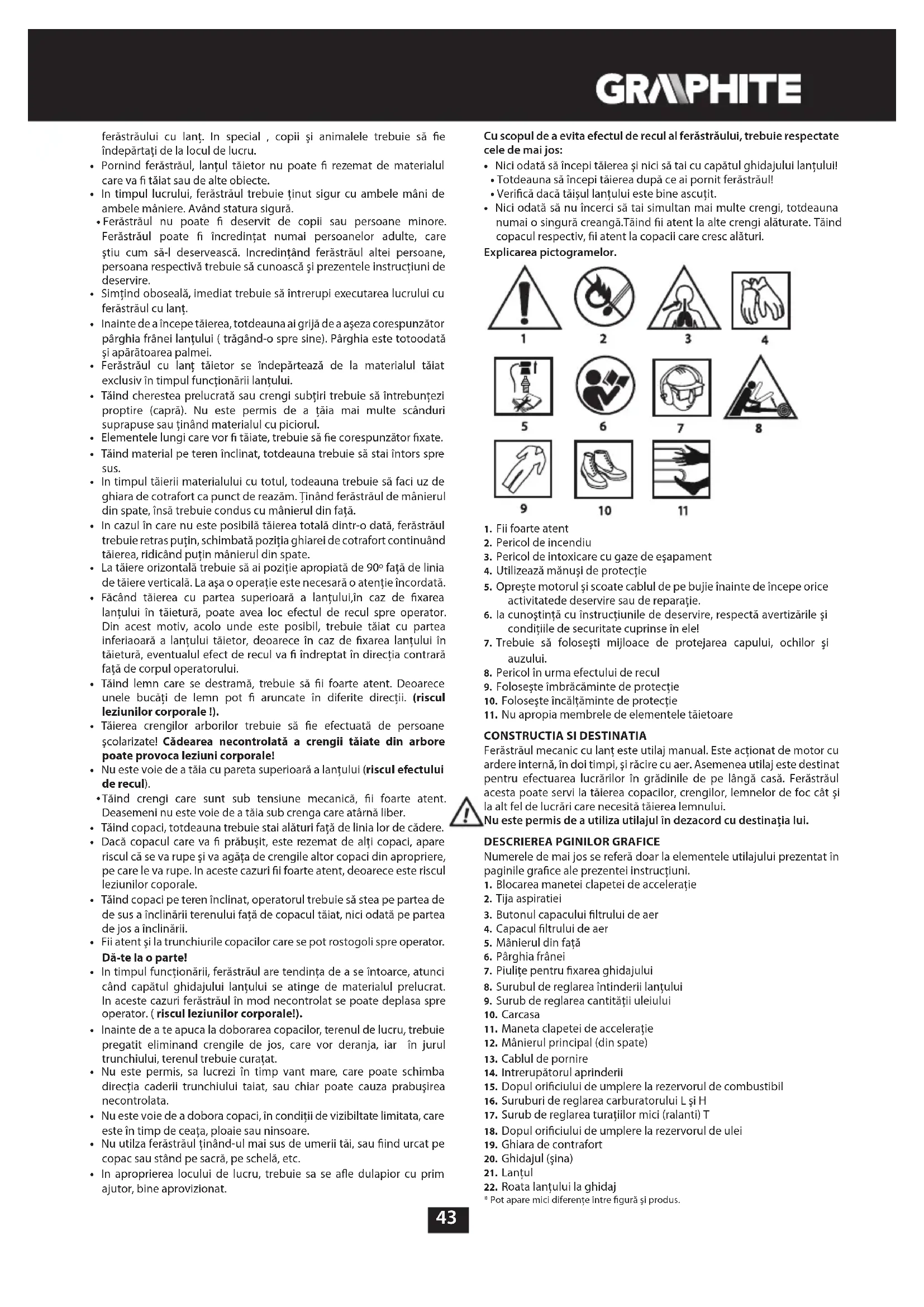- In timpul funcţionării, ferăstrăul are tendinţa de a se întoarce, atunci când capătul ghidajului lanţului se atinge de materialul prelucrat. In aceste cazuri ferăstrăul în mod necontrolat se poate deplasa spre operator. ( riscul leziunilor corporale!).