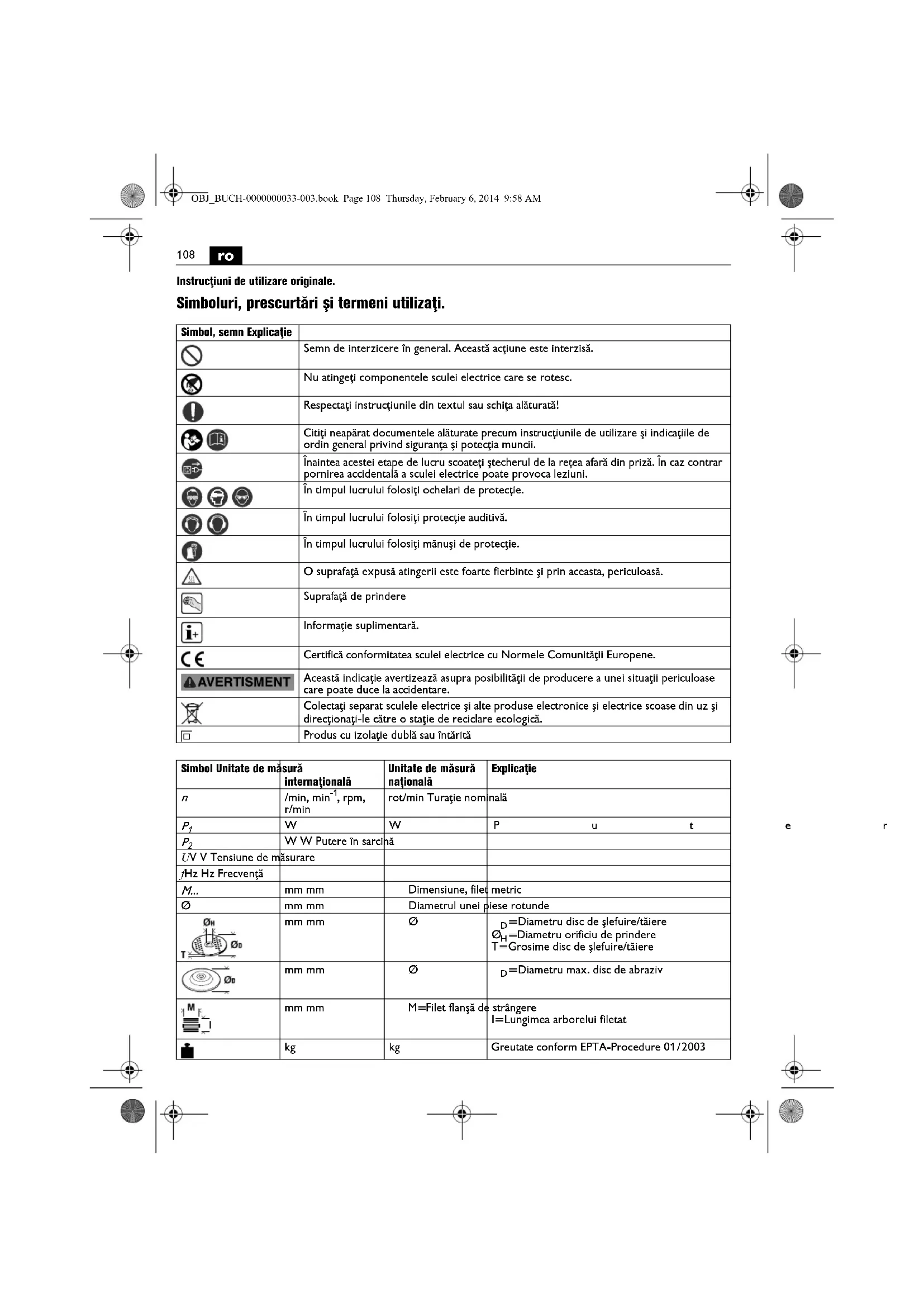Instrucţiuni de utilizare originale. Simboluri, prescurtări şi termeni utilizaţi. Simbol, semn Explicaţie Semn de interzicere în general. Această acţiune este interzisă. Nu atingeţi componentele sculei electrice care se rotesc. Respectaţi instrucţiunile din textul sau schiţa alăturată! Citiţi neapărat documentele alăturate precum instrucţiunile de utilizare şi indicaţiile de ordin general privind siguranţa şi potecţia muncii. Înaintea acestei etape de lucru scoateţi ştecherul de la reţea afară din priză. În caz contrar pornirea accidentală a sculei electrice poate provoca leziuni. În timpul lucrului folosiţi ochelari de protecţie. În timpul lucrului folosiţi protecţie auditivă. În timpul lucrului folosiţi mănuşi de protecţie. O suprafaţă expusă atingerii este foarte fierbinte şi prin aceasta, periculoasă. Suprafaţă de prindere Informaţie suplimentară. Certifică conformitatea sculei electrice cu Normele Comunităţii Europene. Această indicaţie avertizează asupra posibilităţii de producere a unei situaţii periculoase care poate duce la accidentare. Colectaţi separat sculele electrice şi alte produse electronice şi electrice scoase din uz şi direcţionaţi-le către o staţie de reciclare ecologică. Produs cu izolaţie dublă sau întărită Simbol Unitate de măsură internaţională Unitate de măsură naţională Explicaţie