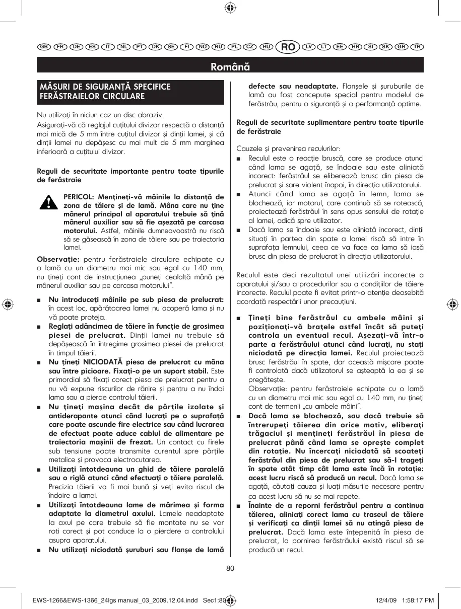 levierului său sub protecţia superioară a lamei şi apoi scoateţi lama. Impedanţa maximă admisă pentru reţeaua electrică este de: - Zmax = 0,245 x Zref pentru modelul EWS-1266 - Zmax = 0,252 x Zref pentru modelele EWS-1366 Dacă aveţi dubii, adresaţi-vă distribuitorului de energie electrică pentru a vă asigura că impedanţa prizelor de curent alternativ (CA) nu depăşesc valorile indicate mai sus. ACCESORII STANDARD Lamă, ghid paralel, cheie de serviciu. REGLAJUL CUŢITULUI DIVIZOR (FIG. 6) APLICAŢII AVERTISMENT! Nu utilizaţi lame de fierăstrău al căror corp este mai gros sau dantura mai îngustă decât grosimea cuţitului divizor. Tăiere în lemn.