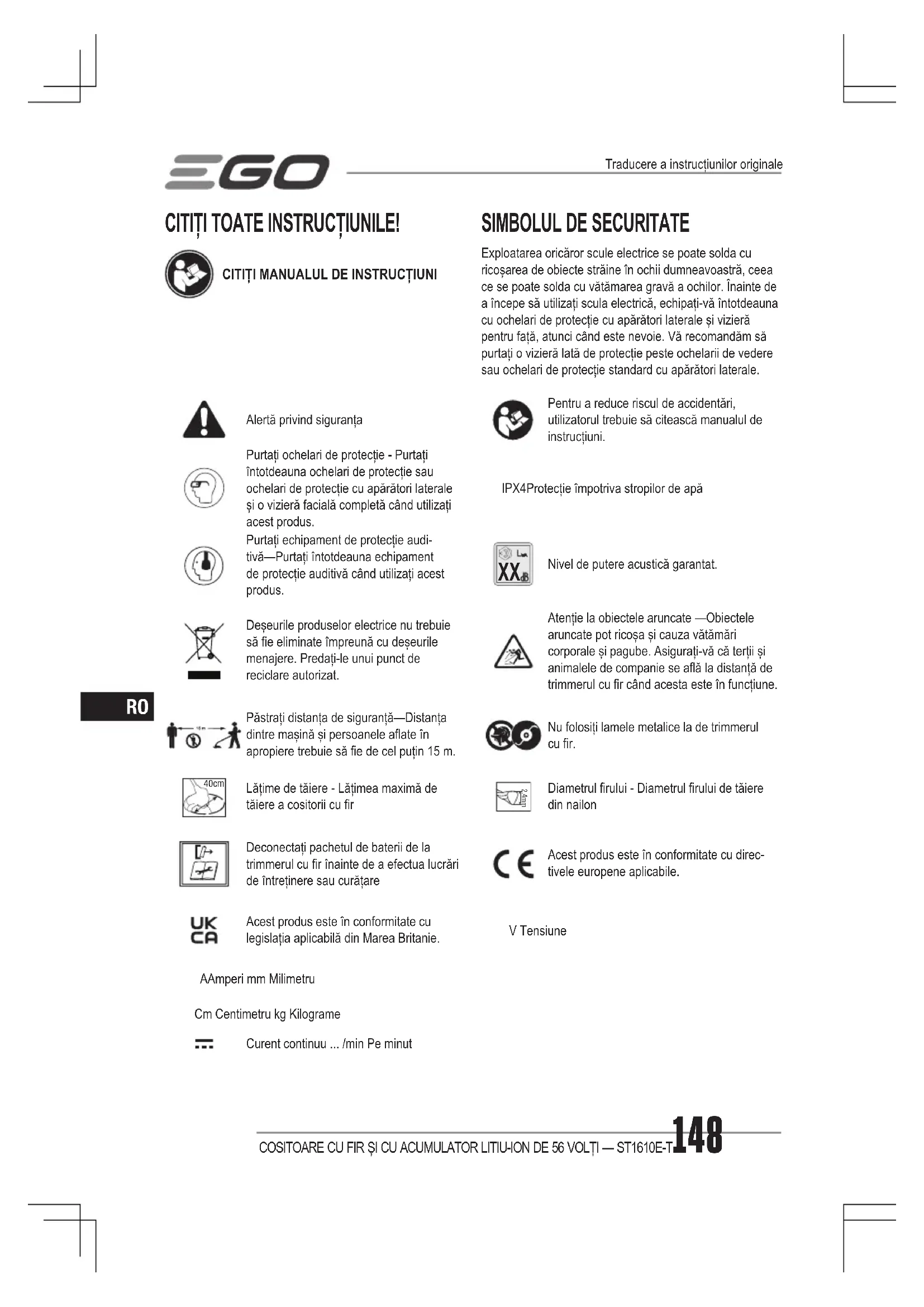 Nivel de putere acustică garantat.Deșeurile produselor electrice nu trebuie să e eliminate împreună cu deșeurile menajere. Predați-le unui punct de reciclare autorizat.Atenție la obiectele aruncate —Obiectele aruncate pot ricoșa și cauza vătămări corporale și pagube. Asigurați-vă că terții și animalele de companie se aă la distanță de trimmerul cu r când acesta este în funcțiune.Păstrați distanța de siguranță—Distanța dintre mașină și persoanele aate în apropiere trebuie să e de cel puțin 15 m.Nu folosiți lamele metalice la de trimmerul cu r. 40cm Lățime de tăiere - Lățimea maximă de tăiere a cositorii cu r 2.4mm Diametrul rului - Diametrul rului de tăiere din nailonDeconectați pachetul de baterii de la trimmerul cu r înainte de a efectua lucrări de întreținere sau curățareAcest produs este în conformitate cu direc-tivele europene aplicabile.Acest produs este în conformitate cu legislația aplicabilă din Marea Britanie.V TensiuneA Amperi mm MilimetruCm Centimetru kg KilogrameCurent continuu ... /min Pe minutTraducere a instrucțiunilor originaleCOSITOARE CU FIR ȘI CU ACUMULATOR LITIU-ION DE 56 VOLȚI — ST1610E-T 149