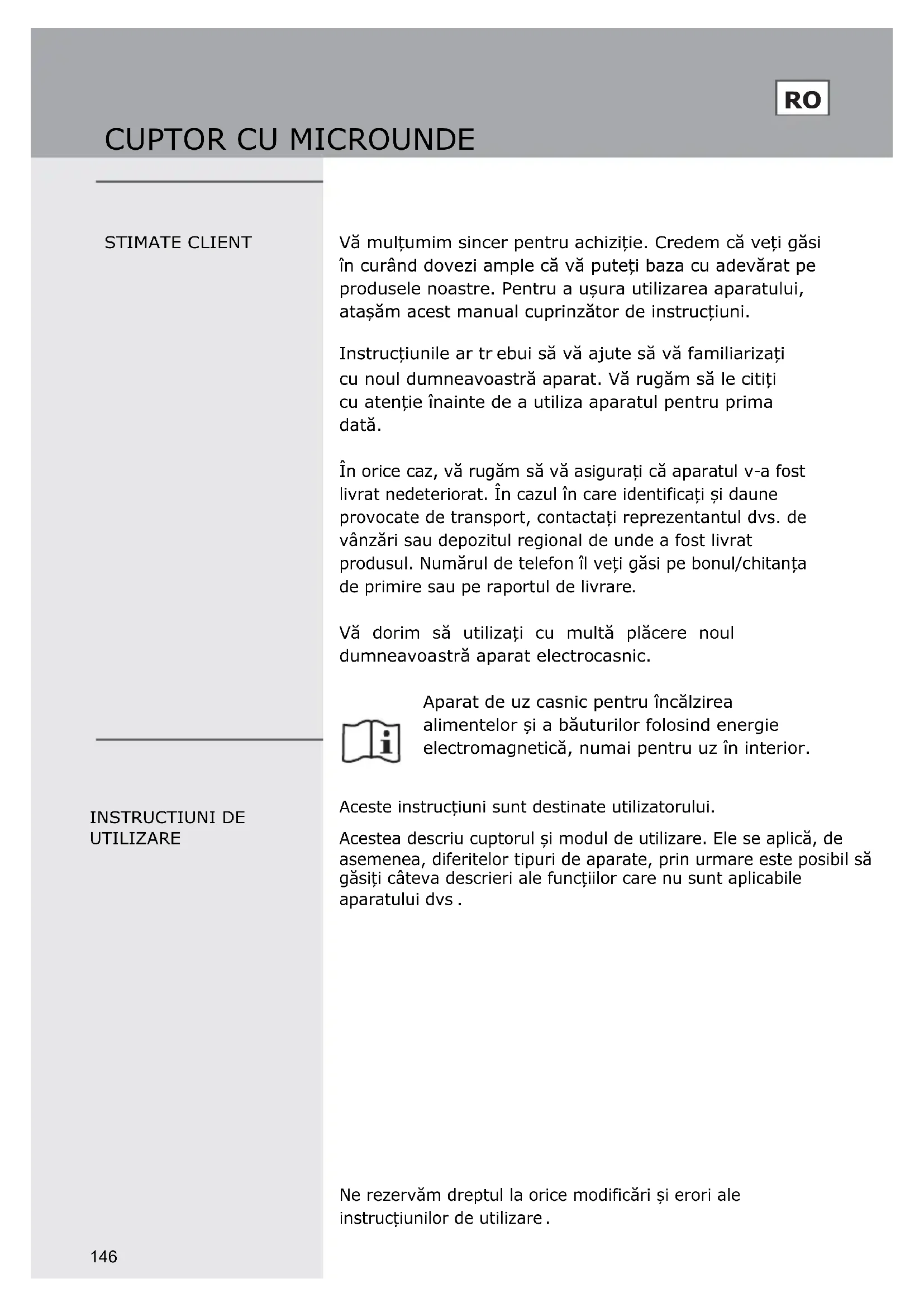 Vă dorim să utilizați cu multă plăcere noul dumneavoastră aparat electrocasnic. Aparat de uz casnic pentru încălzirea alimentelor și a băuturilor folosind energie electromagnetică, numai pentru uz în interior. INSTRUCTIUNI DE UTILIZARE Aceste instrucțiuni sunt destinate utilizatorului. Acestea descriu cuptorul și modul de utilizare. Ele se aplică, de asemenea, diferitelor tipuri de aparate, prin urmare este posibil să găsiți câteva descrieri ale funcțiilor care nu sunt aplicabile aparatului dvs