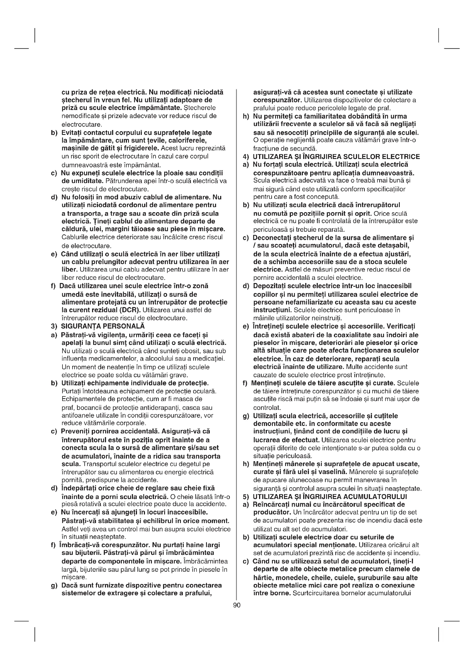 a) Păstraţi-vă vigilenţa, urmăriţi ceea ce faceţi și apelaţi la bunul simţ când utilizaţi o sculă electrică. Nu utilizaţi o sculă electrică când sunteţi obosit, sau sub inuenţa medicamentelor, a alcoolului sau a medicaţiei. Un moment de neatenţie în timp ce utilizaţi sculele electrice se poate solda cu vătămări grave. b) Utilizaţi echipamente individuale de protecţie. Purtaţi întotdeauna echipament de protecţie oculară. Echipamentele de protecţie, cum ar masca de praf, bocancii de protecţie antiderapanţi, casca sau antifoanele utilizate în condiţii corespunzătoare, vor reduce vătămările corporale. c) Preveniţi pornirea accidentală. Asiguraţi-vă că întrerupătorul este în poziţia oprit înainte de a conecta scula la o sursă de alimentare și/sau set de acumulatori, înainte de a ridica sau transporta scula. Transportul sculelor electrice cu degetul pe întrerupător sau cu alimentarea cu energie electrică pornită, predispune la accidente. d) Îndepărtaţi orice cheie de reglare sau cheie xă înainte de a porni scula electrică. O cheie lăsată într-o piesă rotativă a sculei electrice poate duce la accidente. e) Nu încercaţi să ajungeţi în locuri inaccesibile. Păstraţi-vă stabilitatea și echilibrul în orice moment. Astfel veţi avea un control mai bun asupra sculei electrice în situaţii neașteptate. f) Îmbrăcaţi-vă corespunzător. Nu purtaţi haine largi sau bijuterii. Păstraţi-vă părul și îmbrăcămintea departe de componentele în mișcare. Îmbrăcămintea largă, bijuteriile sau părul lung se pot prinde în piesele în mișcare. g) Dacă sunt furnizate dispozitive pentru conectarea sistemelor de extragere și colectare a prafului,91 GENERALITĂȚI