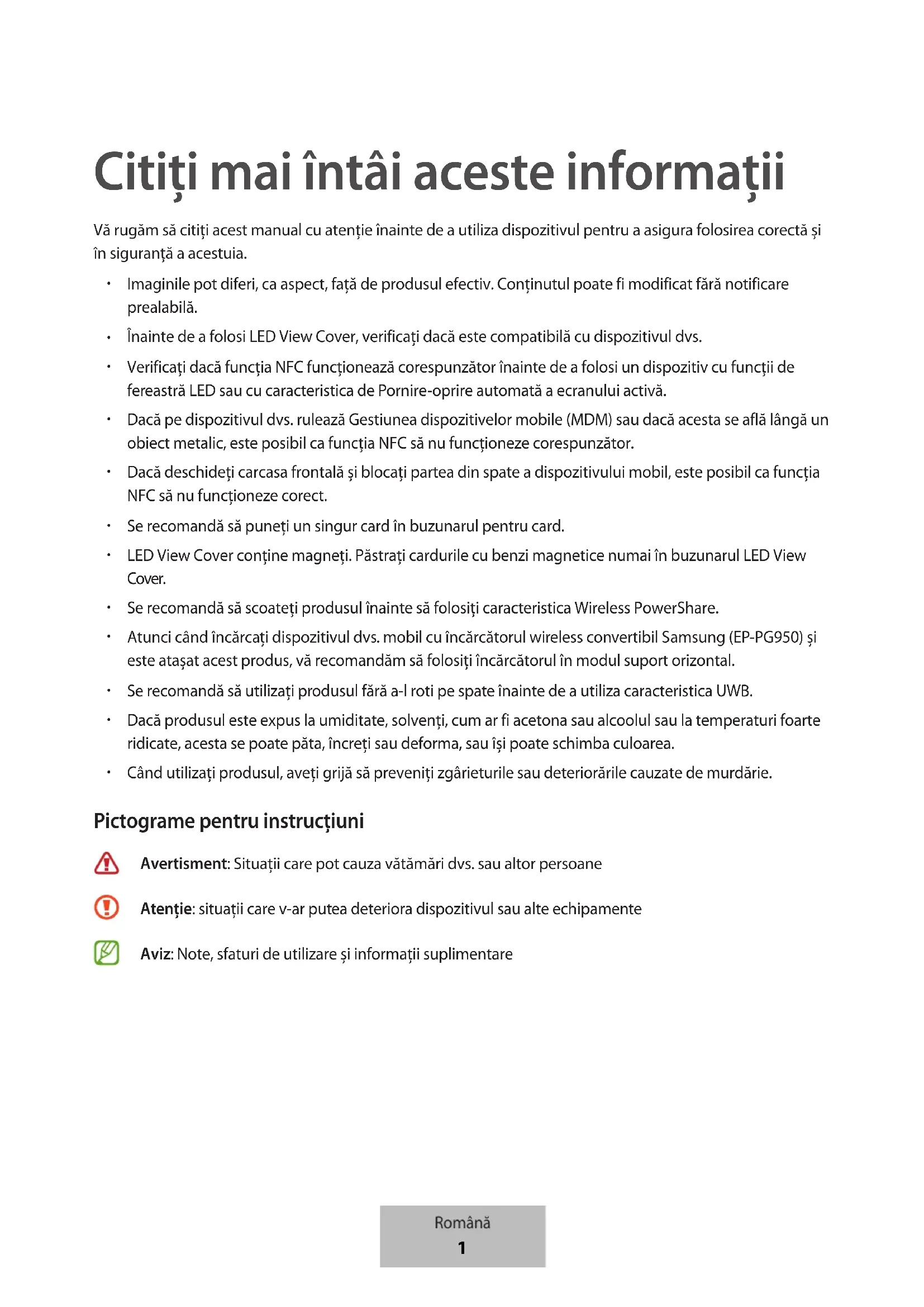 Când utilizați produsul, aveți grijă să preveniți zgârieturile sau deteriorările cauzate de murdărie. Pictograme pentru instrucţiuni Avertisment: Situaţii care pot cauza vătămări dvs. sau altor persoane Atenție: situații care v-ar putea deteriora dispozitivul sau alte echipamente Aviz: Note, sfaturi de utilizare şi informaţii suplimentare Română