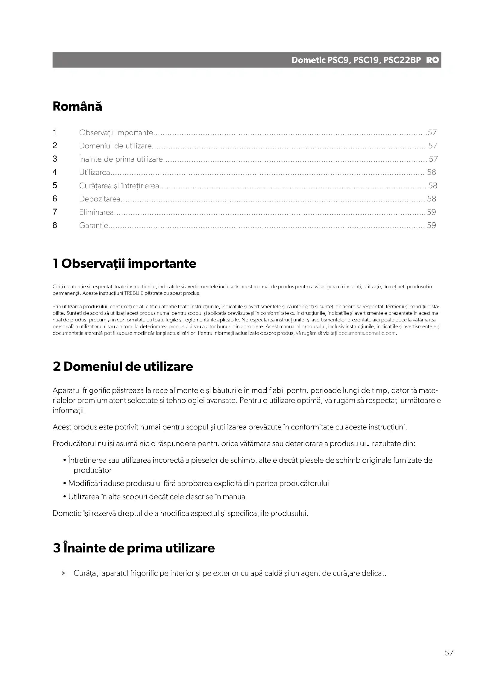 Garanţie...................................................................................................................................... 59 1 Observaţii importante Citiţi cu atenţie şi respectaţi toate instrucţiunile, indicaţiile şi avertismentele incluse în acest manual de produs pentru a vă asigura că instalaţi, utilizaţi şi întreţineţi produsul în permanenţă. Aceste instrucţiuni TREBUIE păstrate cu acest produs. Prin utilizarea produsului, confirmaţi că aţi citit cu atenţie toate instrucţiunile, indicaţiile şi avertismentele şi că înţelegeţi şi sunteţi de acord să respectaţi termenii şi condiţiile sta- bilite. Sunteţi de acord să utilizaţi acest produs numai pentru scopul şi aplicaţia prevăzute şi în conformitate cu instrucţiunile, indicaţiile şi avertismentele prezentate în acest ma- nual de produs, precum şi în conformitate cu toate legile şi reglementările aplicabile. Nerespectarea instrucţiunilor şi avertismentelor prezentate aici poate duce la vătămarea personală a utilizatorului sau a altora, la deteriorarea produsului sau a altor bunuri din apropiere. Acest manual al produsului, inclusiv instrucţiunile, indicaţiile şi avertismentele şi documentaţia aferentă pot fi supuse modificărilor şi actualizărilor. Pentru informaţii actualizate despre produs, vă rugăm să vizitaţi documents.dometic.com. 2 Domeniul de utilizare Aparatul frigorific păstrează la rece alimentele şi băuturile în mod fiabil pentru perioade lungi de timp, datorită mate- rialelor premium atent selectate şi tehnologiei avansate. Pentru o utilizare optimă, vă rugăm să respectaţi următoarele informaţii. Acest produs este potrivit numai pentru scopul şi utilizarea prevăzute în conformitate cu aceste instrucţiuni. Producătorul nu îşi asumă nicio răspundere pentru orice vătămare sau deteriorare a produsului