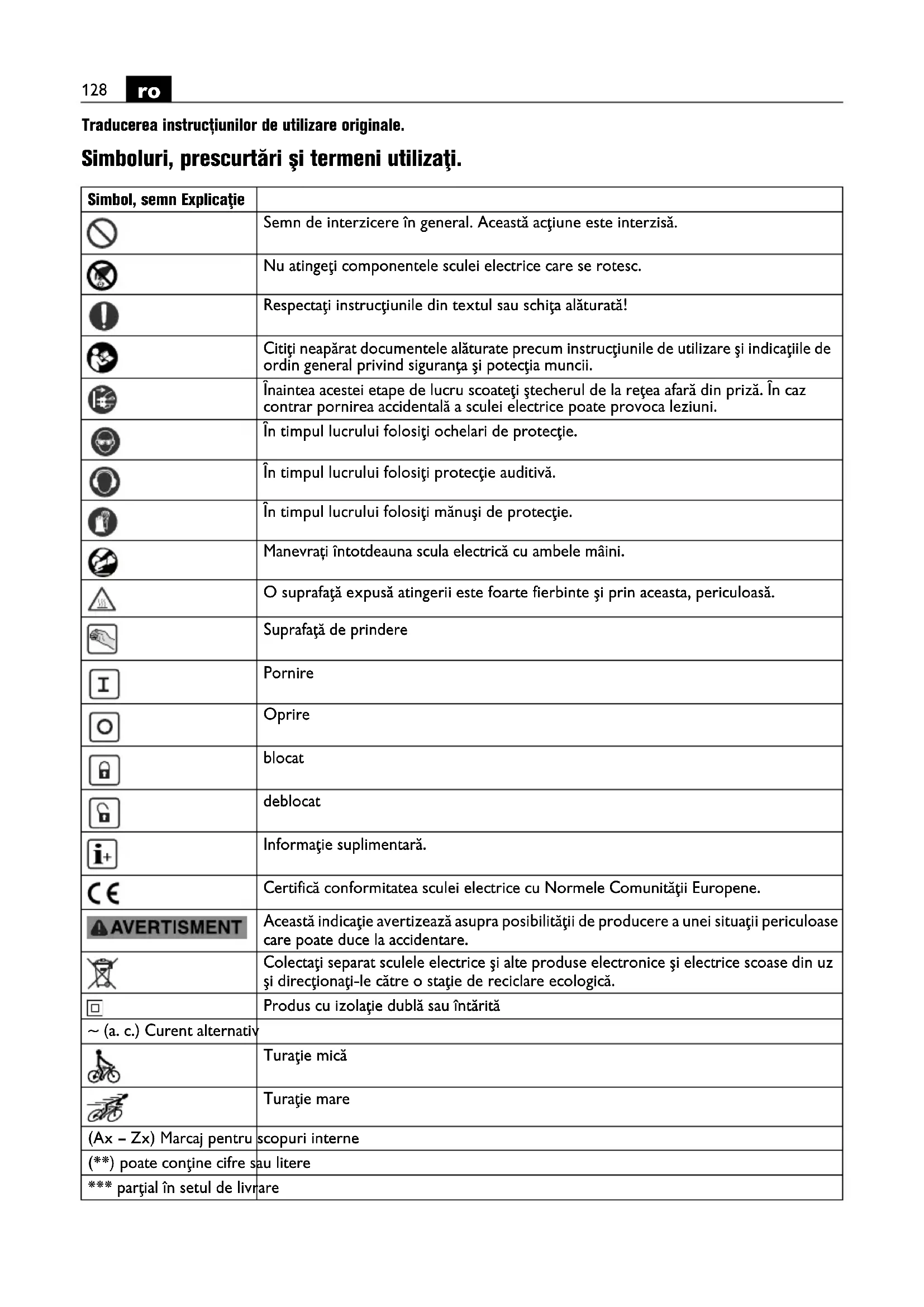 Traducerea instrucțiunilor de utilizare originale. Simboluri, prescurtări şi termeni utilizaţi. Simbol, semn Explicaţie Semn de interzicere în general. Această acţiune este interzisă. Nu atingeţi componentele sculei electrice care se rotesc. Respectaţi instrucţiunile din textul sau schiţa alăturată! Citiţi neapărat documentele alăturate precum instrucţiunile de utilizare şi indicaţiile de ordin general privind siguranţa şi potecţia muncii. Înaintea acestei etape de lucru scoateţi ştecherul de la reţea afară din priză. În caz contrar pornirea accidentală a sculei electrice poate provoca leziuni. În timpul lucrului folosiţi ochelari de protecţie. În timpul lucrului folosiţi protecţie auditivă. În timpul lucrului folosiţi mănuşi de protecţie. Manevrați întotdeauna scula electrică cu ambele mâini. O suprafaţă expusă atingerii este foarte fierbinte şi prin aceasta, periculoasă. Suprafaţă de prindere Pornire Oprire blocat deblocat Informaţie suplimentară. Certifică conformitatea sculei electrice cu Normele Comunităţii Europene. Această indicaţie avertizează asupra posibilităţii de producere a unei situaţii periculoase care poate duce la accidentare. Colectaţi separat sculele electrice şi alte produse electronice şi electrice scoase din uz şi direcţionaţi-le către o staţie de reciclare ecologică. Produs cu izolaţie dublă sau întărită ~ (a. c.) Curent alternativ Turaţie mică Turaţie mare (Ax – Zx) Marcaj pentru scopuri interne (**) poate conţine cifre sau litere *** parţial în setul de livrare129