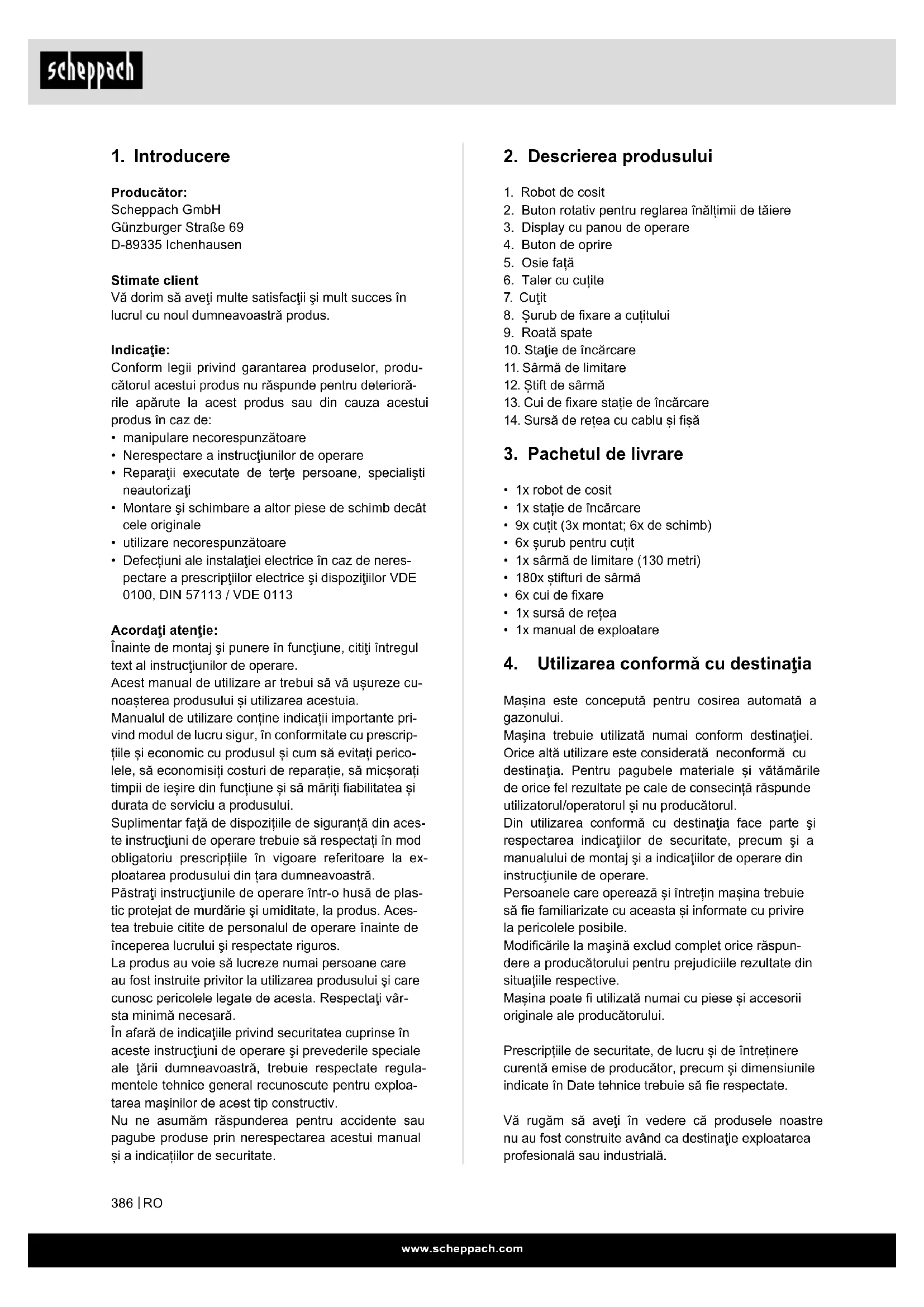 Mașina este concepută pentru cosirea automată a gazonului. Maşina trebuie utilizată numai conform destinaţiei. Orice altă utilizare este considerată neconformă cu destinaţia. Pentru pagubele materiale și vătămările de orice fel rezultate pe cale de consecință răspunde utilizatorul/operatorul și nu producătorul. Din utilizarea conformă cu destinaţia face parte şi respectarea indicaţiilor de securitate, precum şi a manualului de montaj şi a indicaţiilor de operare din instrucţiunile de operare. Persoanele care operează și întrețin mașina trebuie să e familiarizate cu aceasta și informate cu privire la pericolele posibile. Modicările la maşină exclud complet orice răspun- dere a producătorului pentru prejudiciile rezultate din situaţiile respective. Mașina poate utilizată numai cu piese și accesorii originale ale producătorului. Prescripțiile de securitate, de lucru și de întreținere curentă emise de producător, precum și dimensiunile indicate în Date tehnice trebuie să e respectate. Vă rugăm să aveţi în vedere că produsele noastre nu au fost construite având ca destinaţie exploatarea profesională sau industrială.
