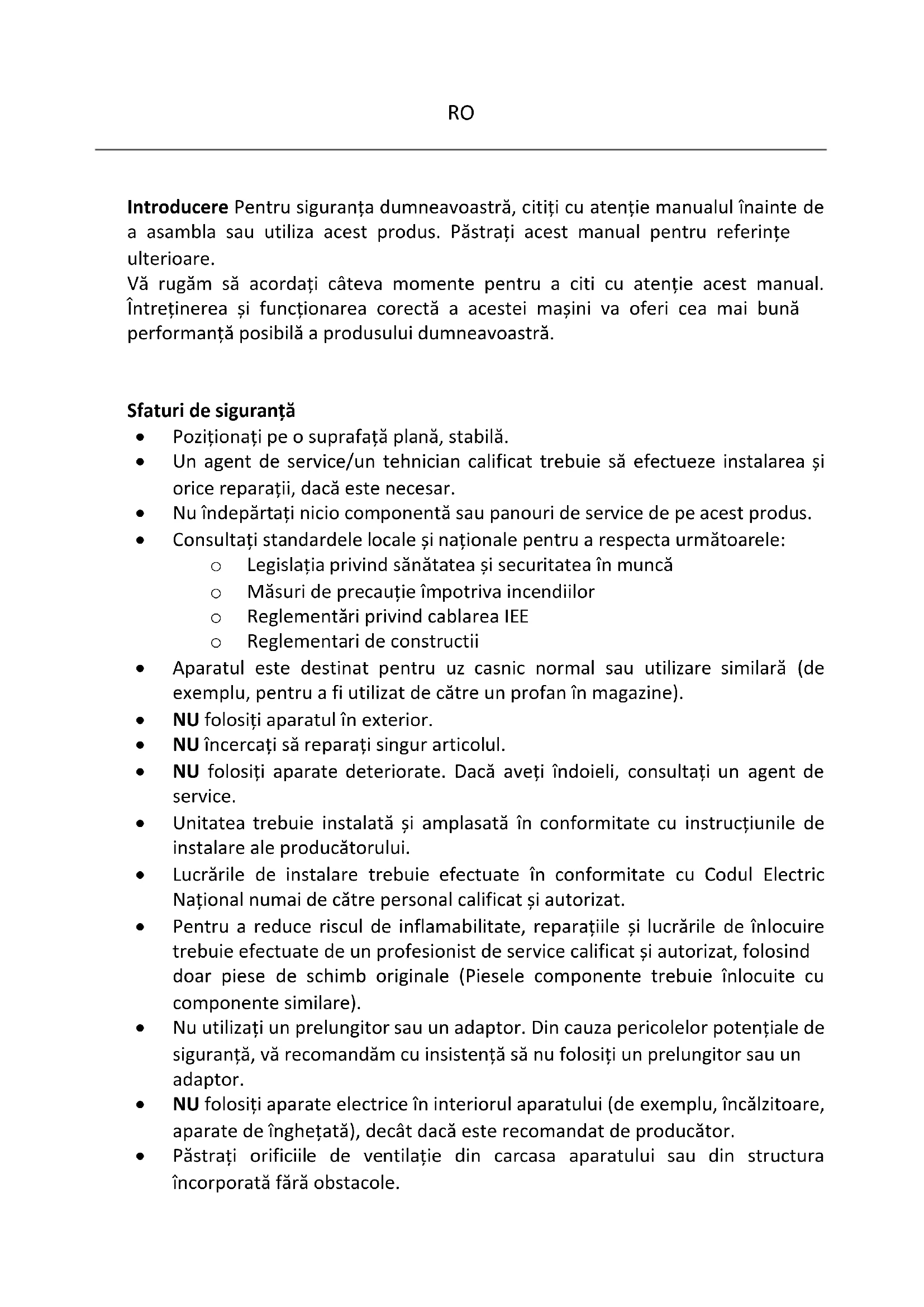 Introducere Pentru siguranța dumneavoastră, citiți cu atenție manualul înainte de a asambla sau utiliza acest produs. Păstrați acest manual pentru referințe ulterioare. Vă rugăm să acordați câteva momente pentru a citi cu atenție acest manual. Întreținerea și funcționarea corectă a acestei mașini va oferi cea mai bună performanță posibilă a produsului dumneavoastră.