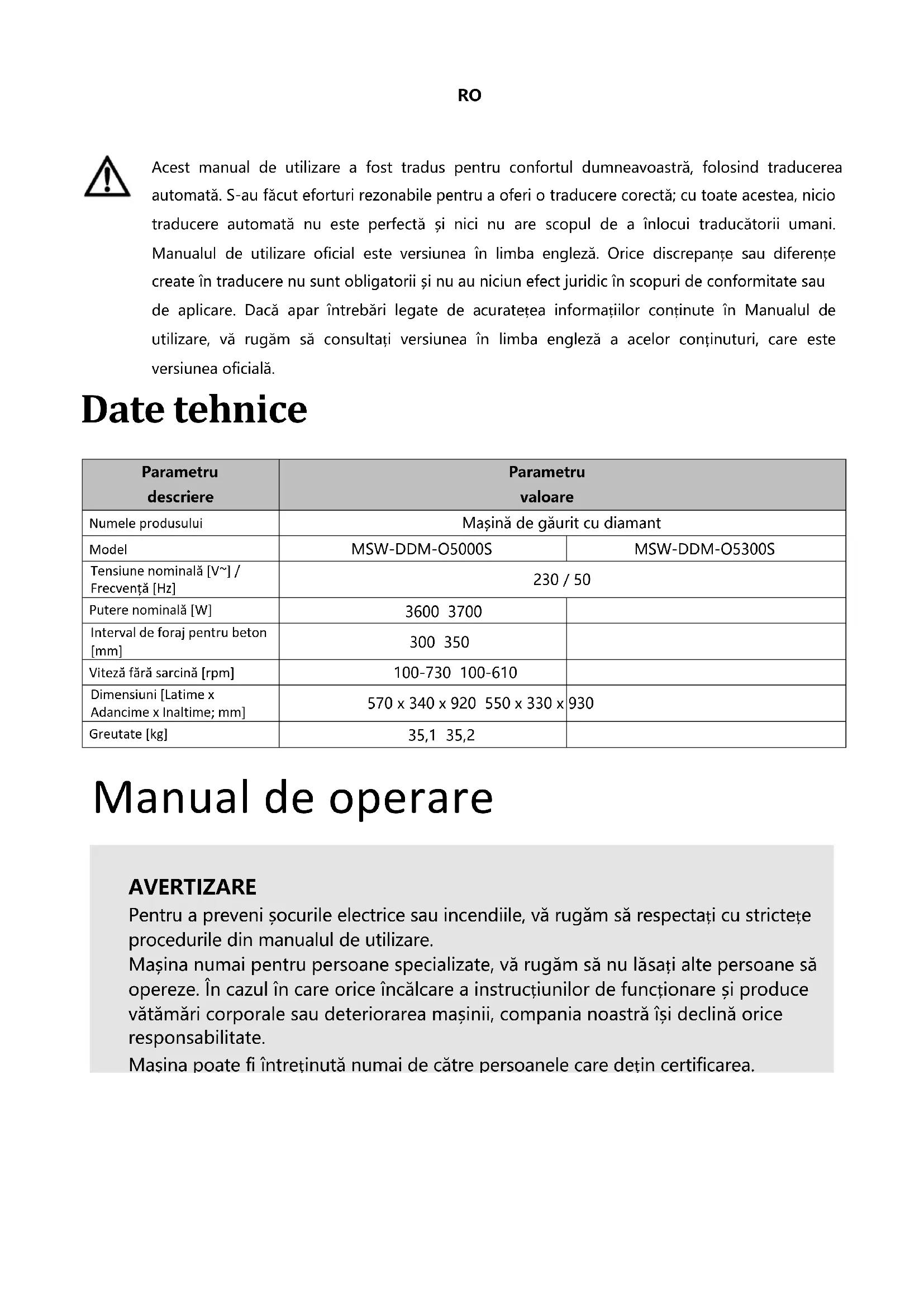 Tensiune nominală [V~] / Frecvență [Hz] 230 / 50 Putere nominală [W] 3600 3700 Interval de foraj pentru beton [mm] 300 350 Viteză fără sarcină [rpm] 100-730 100-610 Dimensiuni [Latime x Adancime x Inaltime; mm] 570 x 340 x 920 550 x 330 x 930 Greutate [kg] 35,1 35,2 Manual de operareRO