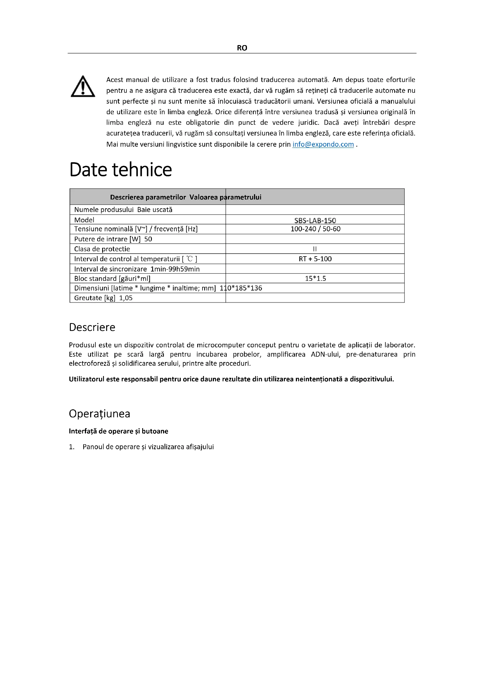 a) Apăsați tasta butonul pentru a combina punctele de temperatură ale S1, S2, S3, S4 și S5 în programe de conexiune cu mai multe puncte, cum ar fi S1-S2, S1-S2-S3, S1-S2-S3-S4 sau S1-S2-S3 -S4- S5. OBSERVA! Punctul de temperatură al programului cu mai multe puncte poate începe doar de la S1. b) De exemplu, pentru a seta un program de conectare pentru S1-S2-S3-S4, apăsați tasta buton. Afișajul va afișa configurația curentă, unde S1 este nodul de pornire (care nu poate fi schimbat) și S2 este nodul final (care poate fi modificat). Apăsați tasta butonul pentru a schimba S2 în S4. Apoi ap ăsați butonul pentru a confirma setarea. Configurația nodului va fi afișată ca S1-4, iar programul va rula prin secvența S1-S2-S3-S4. c) Presa butonul din nou pentru a rula programul de conectare în patru puncte S1-S2-S3-S4.RO Operați programul cu mai multe puncte OBSERVA! După selectarea nodului final, puteți apăsa butonul pentru a rula direct programul cu mai multe puncte. Curățare și întreținere Utilizați o cârpă curată și moale umezită cu o cantitate mică de alcool anhidru pentru a curăța orificiile conice din blocurile instrumentului. Acest lucru asigură un contact complet și o conducere eficientă a căldurii între eprubetă și găurile conice, prevenind în același timp contaminarea. Dacă apar pete pe suprafața instrumentului, curățați-l cu o cârpă moale și o pastă de curățare blândă. ATENŢIE Asigurați-vă că sursa de alimentare este oprită înainte de curățarea instrumentului. NU permiteți agenților de curățare să pătrundă în orificiile conice în timpul curățării. Evitați utilizarea agenților de curățare corozivi pe suprafața instrumentului. Aruncarea dispozitivelor uzate Nu aruncați acest dispozitiv în sistemele de deșeuri municipale. Predați-l la un punct de reciclare și colectare a dispozitivelor electrice și electrice. Verificați simbolul de pe produs, manualul de instrucțiuni și ambalaj. Materialele plastice folosite la construirea dispozitivului pot fi reciclate urmând marcajele lor. Alegând să reciclați, aduceți o contribuție semnificativă la protecția mediului nostru. Contactați autoritățile locale pentru informații despre unitatea locală de reciclare.SL Ta uporabniški priročnik je bil preveden s strojnim prevajanjem. Potrudili smo se, da bi zagotovili točnost prevoda, vendar upoštevajte, da avtomatizirani prevodi niso popolni in niso namenjeni nadomestitvi človeških prevajalcev. Uradna različica uporabniškega priročnika je v angleščini. Morebitne razlike med prevedeno različico in izvirno angleščino niso pravno zavezujoče. Če imate kakršna koli vprašanja o točnosti prevoda, si oglejte angleško različico, ki je uradna referenca. Več jezikovnih različic je na voljo na zahtevo preko info@expondo.com . Tehnični podatki Opis parametra Vrednost parametra Ime izdelka Suha kopel Model Nazivna napetost [V~] / frekvenca [Hz] 100-240 / 50-60 Vhodna moč [W] 50 Zaščitni razred Območje nadzora temperature [ ℃ ] RT + 5-100 Časovno območje 1min-99h59min Standardni blok [luknje*ml] 15*1.5 Dimenzije [širina * dolžina * višina; mm] 110*185*136 Teža [kg] 1,05 Opis Izdelek je mikroračunalniško vodena naprava, zasnovana za različne laboratorijske aplikacije. Med drugimi postopki se široko uporablja za inkubacijo vzorcev, pomnoževanje DNK, preddenaturacijo z elektroforezo in strjevanje seruma. Uporabnik odgovarja za vso škodo, ki nastane zaradi nenamenske uporabe naprave. Delovanje Operacijski vmesnik in gumbi