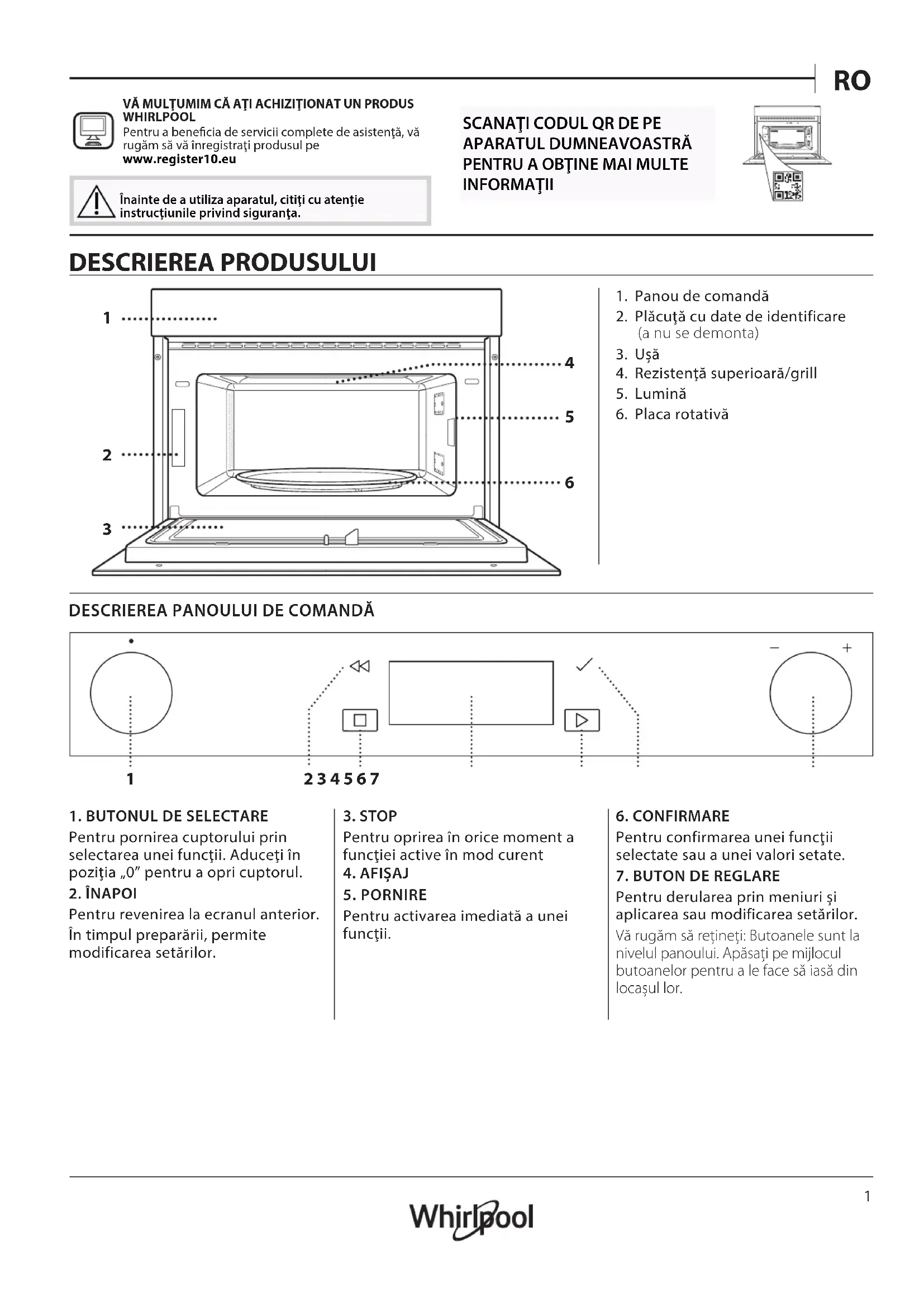 VĂ MULŢUMIM CĂ AŢI ACHIZIŢIONAT UN PRODUS WHIRLPOOL Pentru a benecia de servicii complete de asistenţă, vă rugăm să vă înregistraţi produsul pe www.register10.eu Înainte de a utiliza aparatul, citiţi cu atenţie instrucţiunile privind siguranţa.