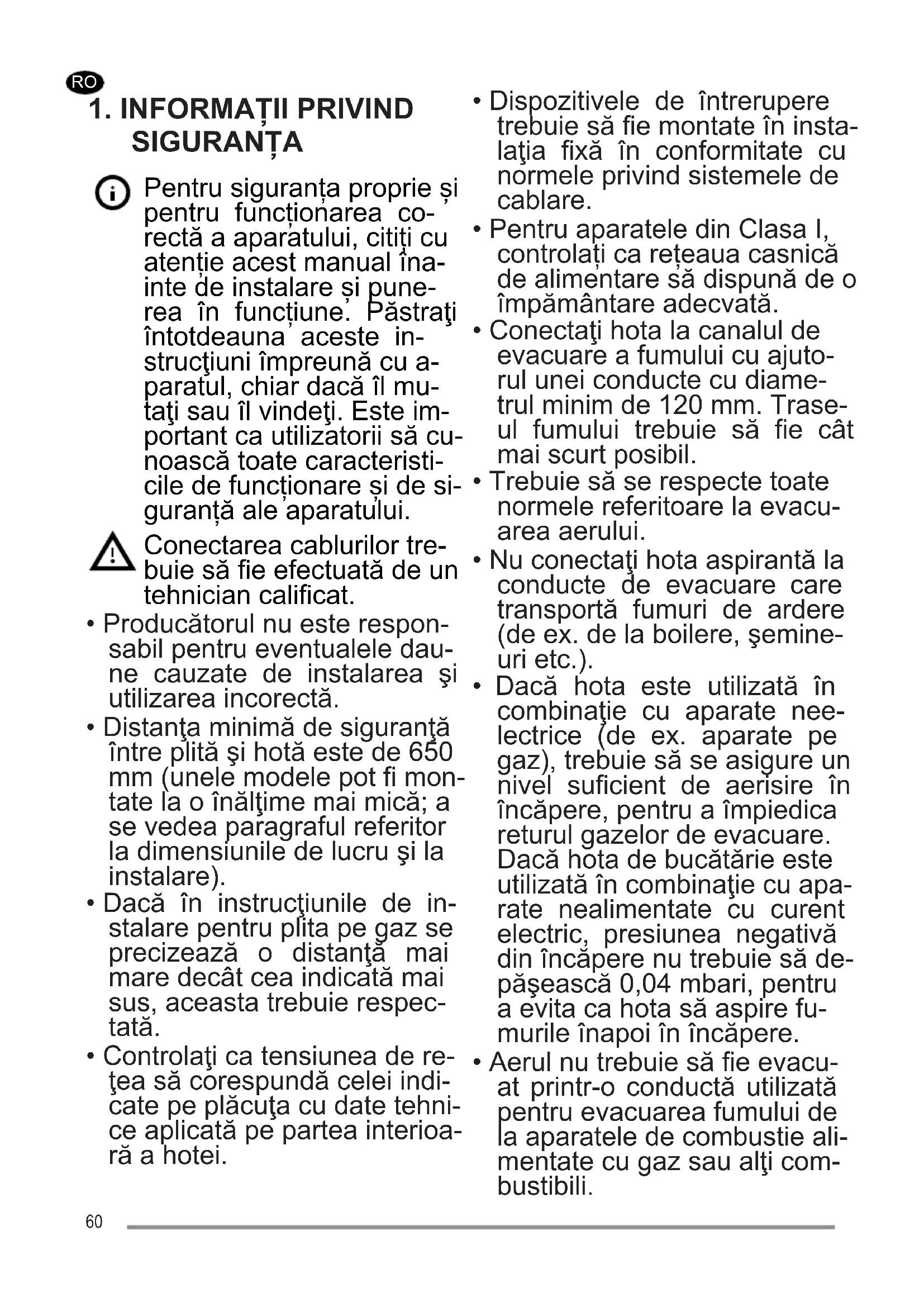 - Trebuie să existe o ventilație corespunzătoare în încăpere atunci când hota este utilizată simultan cu aparate pe gaz sau alți combustibili (nu se aplică în cazul aparatelor ca- re descarcă exclusiv aerul în încăpere).