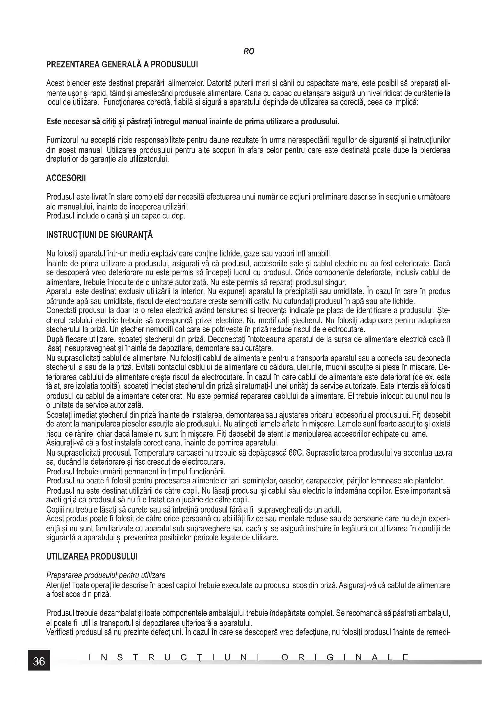 C. Suprasolicitarea produsului va accentua uzura sa, ducând la deteriorare și risc crescut de electrocutare. Produsul trebuie urmărit permanent în timpul funcționării. Produsul nu poate fi folosit pentru procesarea alimentelor tari, semințelor, oaselor, carapacelor, părților lemnoase ale plantelor. Produsul nu este destinat utilizării de către copii. Nu lăsați produsul și cablul său electric la îndemâna copiilor. Este important să aveți grijă ca produsul să nu fi e tratat ca o jucărie de către copii. Copiii nu trebuie lăsați să curețe sau să întrețină produsul fără a fi supravegheați de un adult. Acest produs poate fi folosit de către orice persoană cu abilități fi zice sau mentale reduse sau de persoane care nu dețin experi- ență și nu sunt familiarizate cu aparatul sub supraveghere sau dacă și se asigură instruire în legătură cu utilizarea în condiții de siguranță a aparatului și prevenirea posibilelor pericole legate de utilizare. UTILIZAREA PRODUSULUI Prepararea produsului pentru utilizare Atenție! Toate operațiile descrise în acest capitol trebuie executate cu produsul scos din priză. Asigurați-vă că cablul de alimentare a fost scos din priză. Produsul trebuie dezambalat și toate componentele ambalajului trebuie îndepărtate complet. Se recomandă să păstrați ambalajul, el poate fi util la transportul și depozitarea ulterioară a aparatului. Verifi cați produsul să nu prezinte defecțiuni. În cazul în care se descoperă vreo defecțiune, nu folosiți produsul înainte de remedi-37