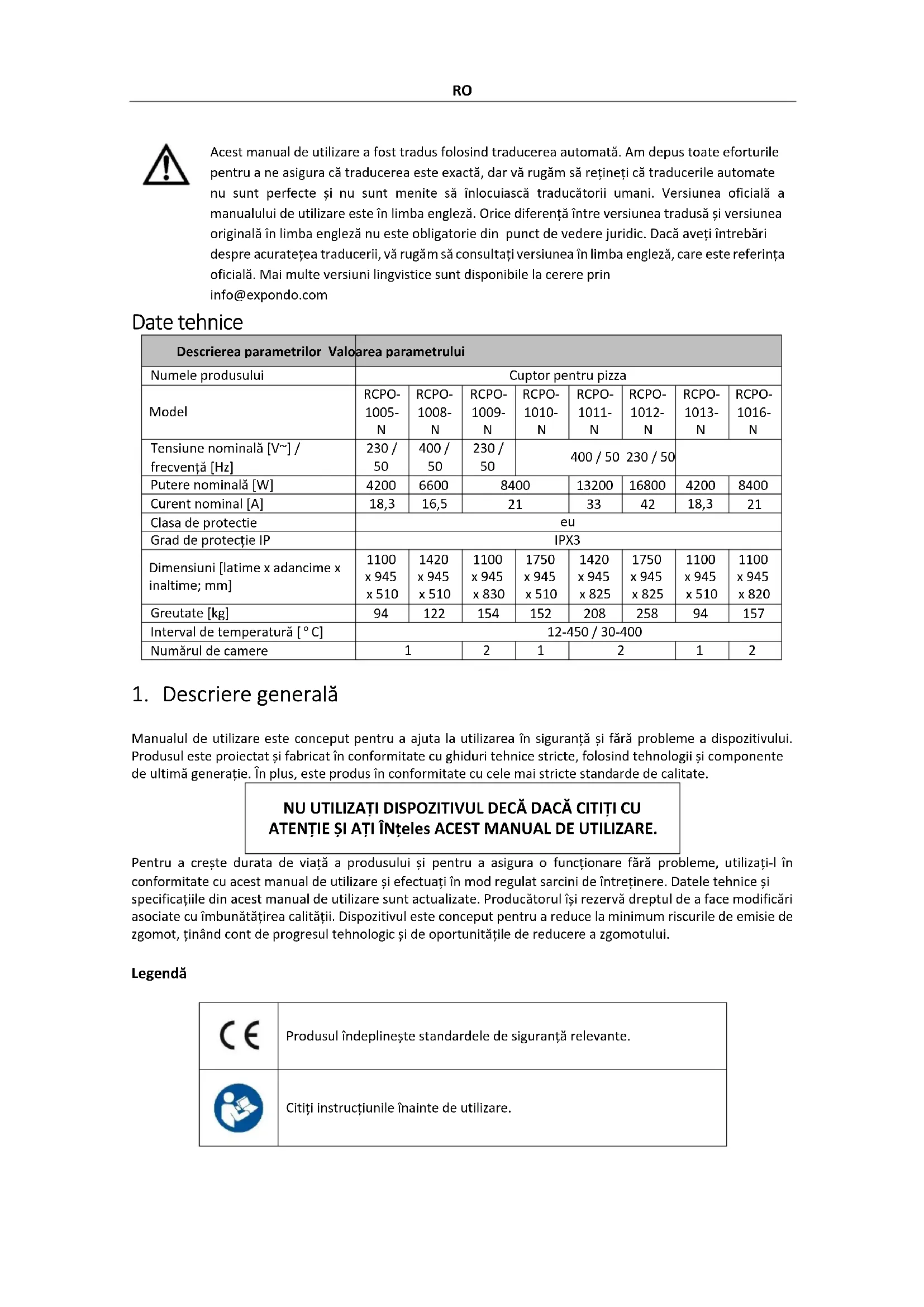 Acest manual de'utilizar a fost tradus folosind traducerea automata. Am depus toate eforturile pentru a ne asigura că traducerea este exactă, dar va rugăm să rețineți că traducerile automate nu sunt perfecteși nu sunt menite să inlocuiasca traducatori i umani. Versiunea oficială a manualului de'utilizar este în limba engleză. Orice diferență în titre versiunea tradusăși versiunea originală în limba engleză nu este obligatorie din punct de vedere juridic. Daca aveți înrebări despree acurateteia traduceri, va rugăm să consulțați versiunea în limba engleză, care este referinta oficială. Mai multe versiuni lingvistice sunt disponibile la cerere prin info@expondo.com