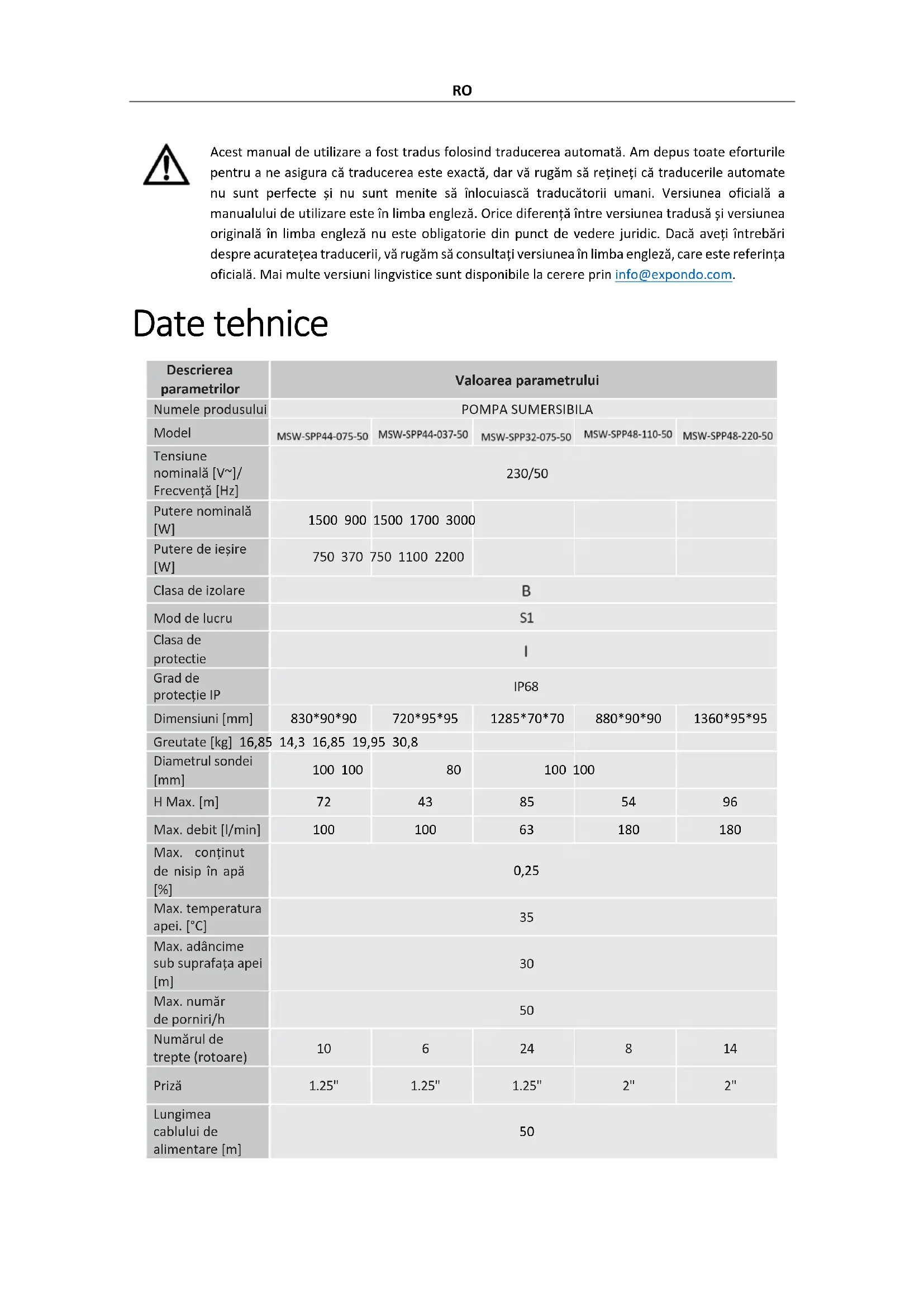 Priză 1.25" 1.25" 1.25" 2" 2" Lungimea cablului de alimentare [m] 50RO Max. debit de apă [m3/h] 6 6 3,78 10,8 10,8 Descrierea parametrilor Valoarea parametrului Numele produsului POMPA SUMERSIBILA Model Tensiune nominală [V~]/Frecvență [Hz] 230/50 Putere nominală [W]