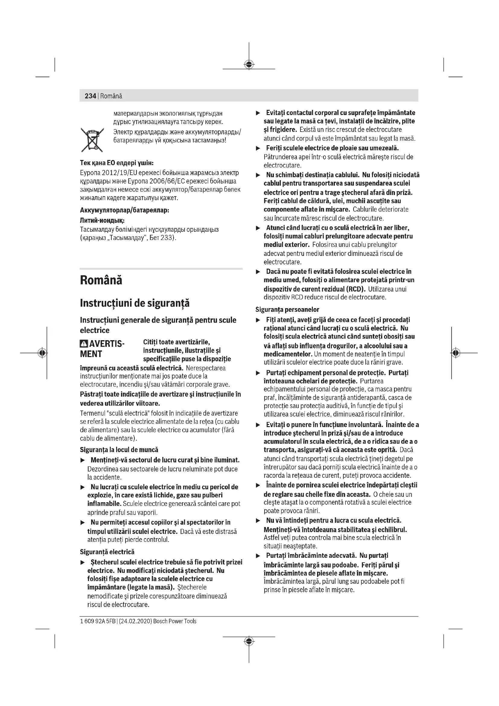 Бұл литий-иондық аккумуляторлар қауіпті тауарларға қойылатын талаптарға сай болуы керек. Пайдаланушы аккумуляторларды көшеде қосымша құжаттарсыз тасымалдай алады. Үшінші тұлғалар (мысалы, әуе көлігі немесе жіберу) орамаға және маркаларға қойылатын арнайы талаптарды сақтау керек. Жіберуге дайындау кезінде қауіпті жүктерді тасымалдау маманымен хабарласу керек. Аккумуляторды корпусы зақымдалған болса ғана жіберіңіз. Ашық түйіспелерді желімдеңіз және аккумуляторды орамада қозғалмайтындай ораңыз. Қажет болса, қосымша ұлттық ережелерді сақтаңыз. Кәдеге жарату Электр құралдарды, аккумуляторларды, керек-жарақтарды және орау Bosch Power Tools 1 609 92A 5FB | (24.02.2020)234 | Română материалдарын экологиялық тұрғыдан дұрыс утилизациялауға тапсыру керек. Электр құралдарды және аккумуляторларды/ батареяларды үй қоқысына тастамаңыз! Тек қана ЕО елдері үшін: Еуропа 2012/19/EU ережесі бойынша жарамсыз электр құралдары және Еуропа 2006/66/EC ережесі бойынша зақымдалған немесе ескі аккумулятор/батареялар бөлек жиналып кәдеге жаратылуы қажет. Аккумуляторлар/батареялар: Литий-иондық: Тасымалдау бөліміндегі нұсқауларды орындаңыз (қараңыз „Тасымалдау“, Бет233). Română Instrucţiuni de siguranţă Instrucţiuni generale de siguranţă pentru scule electrice AVERTIS- MENT Citiţi toate avertizările, instrucţiunile, ilustraţiile şi specificaţiile puse la dispoziţie împreună cu această sculă electrică. Nerespectarea instrucţiunilor menţionate mai jos poate duce la electrocutare, incendiu şi/sau vătămări corporale grave. Păstraţi toate indicaţiile de avertizare şi instrucţiunile în vederea utilizărilor viitoare. Termenul "sculă electrică" folosit în indicaţiile de avertizare se referă la sculele electrice alimentate de la reţea (cu cablu de alimentare) sau la sculele electrice cu acumulator (fără cablu de alimentare). Siguranţa la locul de muncă u Menţineţi‑vă sectorul de lucru curat şi bine iluminat. Dezordinea sau sectoarele de lucru neluminate pot duce la accidente. u Nu lucraţi cu sculele electrice în mediu cu pericol de explozie, în care există lichide, gaze sau pulberi inflamabile. Sculele electrice generează scântei care pot aprinde praful sau vaporii. u Nu permiteţi accesul copiilor şi al spectatorilor în timpul utilizării sculei electrice. Dacă vă este distrasă atenţia puteţi pierde controlul. Siguranţă electrică u Ştecherul sculei electrice trebuie să fie potrivit prizei electrice. Nu modificaţi niciodată ştecherul. Nu folosiţi fişe adaptoare la sculele electrice cu împământare (legate la masă). Ştecherele nemodificate şi prizele corespunzătoare diminuează riscul de electrocutare. u Evitaţi contactul corporal cu suprafeţe împământate sau legate la masă ca ţevi, instalaţii de încălzire, plite şi frigidere. Există un risc crescut de electrocutare atunci când corpul vă este împământat sau legat la masă. u Feriţi sculele electrice de ploaie sau umezeală. Pătrunderea apei într‑o sculă electrică măreşte riscul de electrocutare. u Nu schimbaţi destinaţia cablului. Nu folosiţi niciodată cablul pentru transportarea sau suspendarea sculei electrice ori pentru a trage ştecherul afară din priză. Feriţi cablul de căldură, ulei, muchii ascuţite sau componente aflate în mişcare. Cablurile deteriorate sau încurcate măresc riscul de electrocutare. u Atunci când lucraţi cu o sculă electrică în aer liber, folosiţi numai cabluri prelungitoare adecvate pentru mediul exterior. Folosirea unui cablu prelungitor adecvat pentru mediul exterior diminuează riscul de electrocutare. u Dacă nu poate fi evitată folosirea sculei electrice în mediu umed, folosiţi o alimentare protejată printr-un dispozitiv de curent rezidual (RCD). Utilizarea unui dispozitiv RCD reduce riscul de electrocutare. Siguranţa persoanelor u Fiţi atenţi, aveţi grijă de ceea ce faceţi şi procedaţi raţional atunci când lucraţi cu o sculă electrică. Nu folosiţi scula electrică atunci când sunteţi obosiţi sau vă aflaţi sub influenţa drogurilor, a alcoolului sau a medicamentelor. Un moment de neatenţie în timpul utilizării sculelor electrice poate duce la răniri grave. u Purtaţi echipament personal de protecţie. Purtaţi întoteauna ochelari de protecţie. Purtarea echipamentului personal de protecţie, ca masca pentru praf, încălţăminte de siguranţă antiderapantă, casca de protecţie sau protecţia auditivă, în funcţie de tipul şi utilizarea sculei electrice, diminuează riscul rănirilor. u Evitaţi o punere în funcţiune involuntară. Înainte de a introduce ştecherul în priză şi/sau de a introduce acumulatorul în scula electrică, de a o ridica sau de a o transporta, asiguraţi‑vă că aceasta este oprită. Dacă atunci când transportaţi scula electrică ţineţi degetul pe întrerupător sau dacă porniţi scula electrică înainte de a o racorda la reţeaua de curent, puteţi provoca accidente. u Înainte de pornirea sculei electrice îndepărtaţi cleştii de reglare 