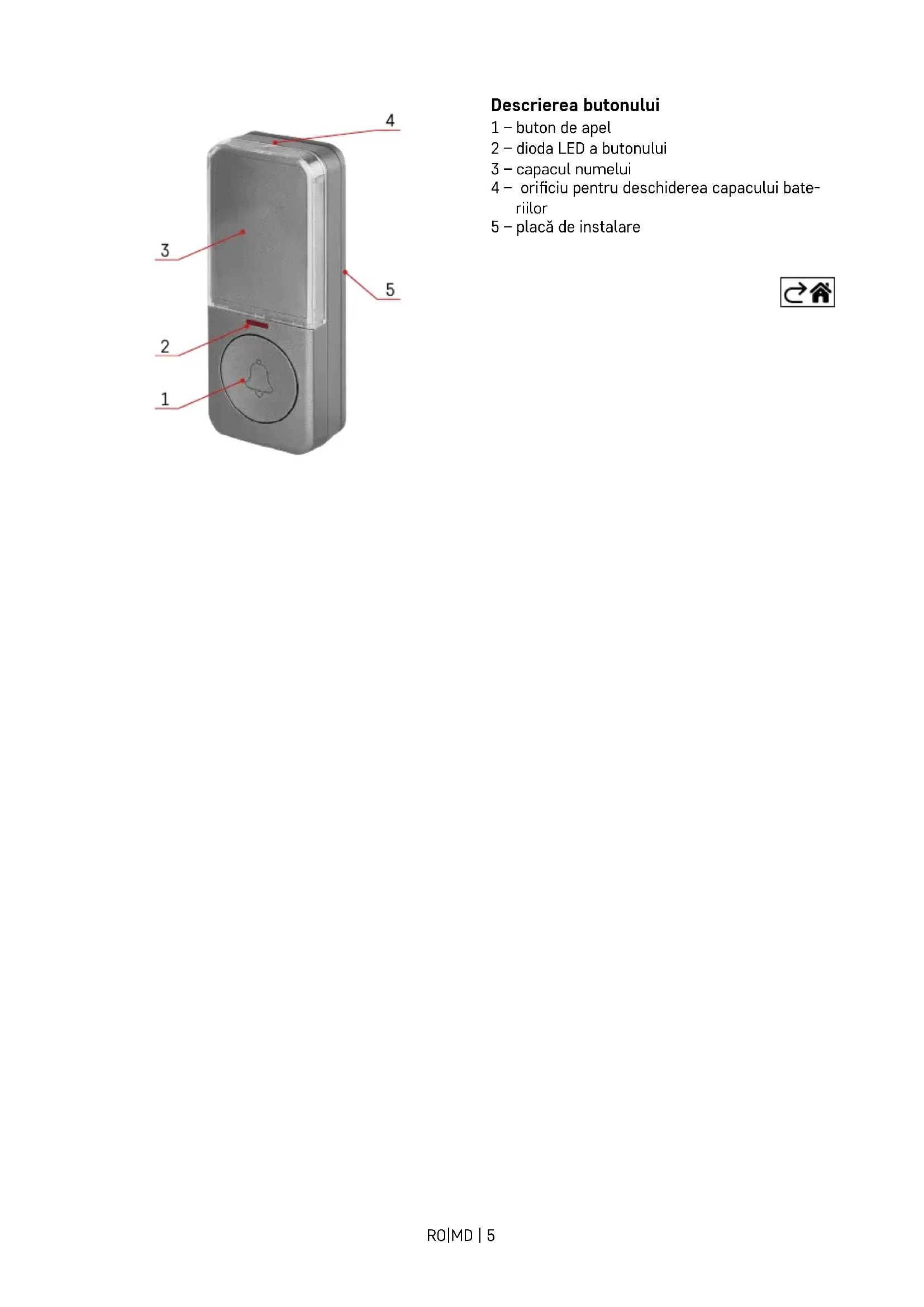 Descrierea butonului 1 – buton de apel 2 – dioda LED a butonului 3 – capacul numelui 4 – oriciu pentru deschiderea capacului bate- riilor 5 – placă de instalareRO|MD | 6 Instalare și montaj Asocierea butonului cu soneria
